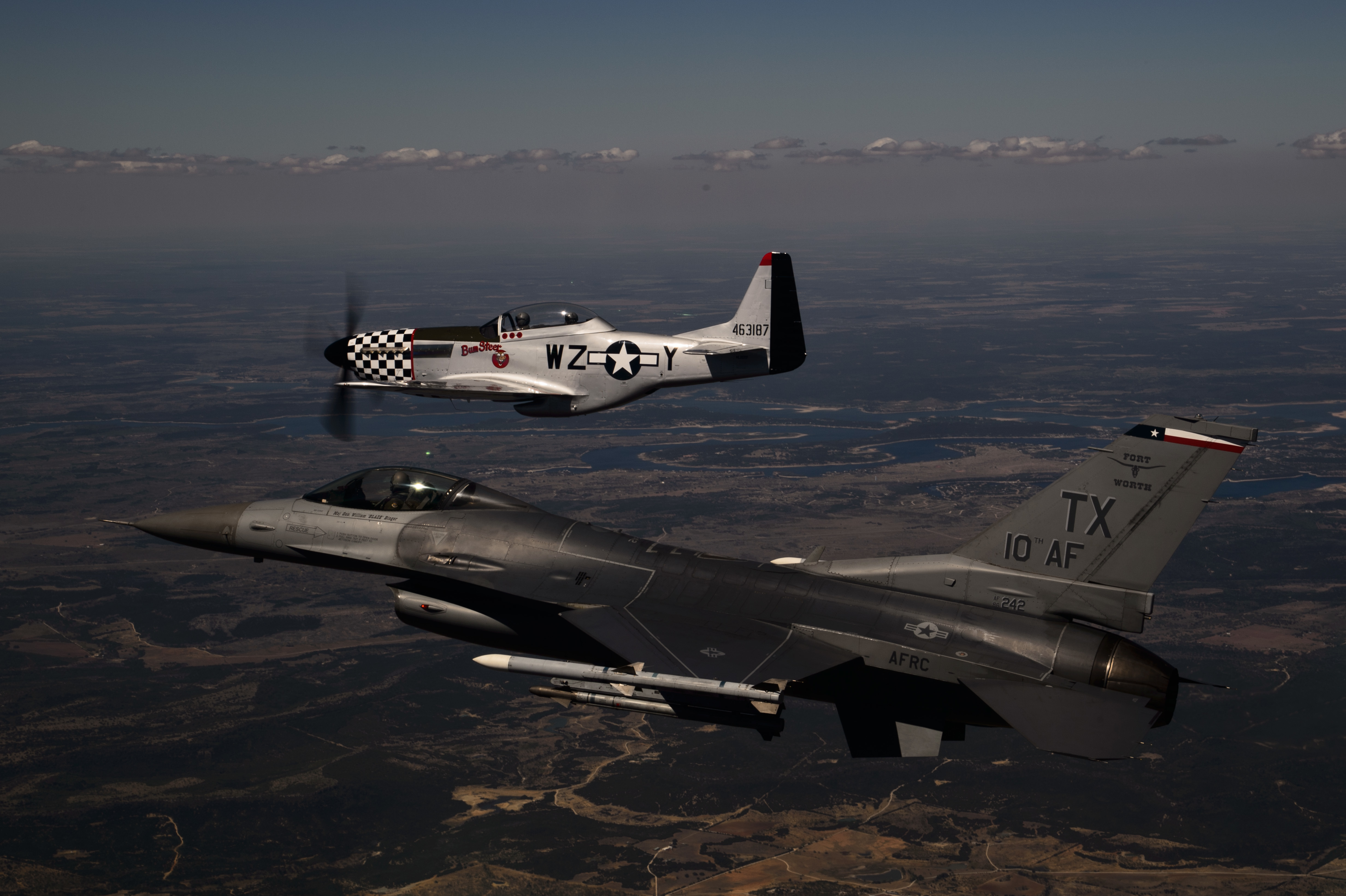 For its 70th anniversary in 2014, the “Spads” put up a memorable two-ship formation over Forth Worth comprising of the currently-flown F-16C and a P-51 Mustang, the first fighter type with which it was equipped.