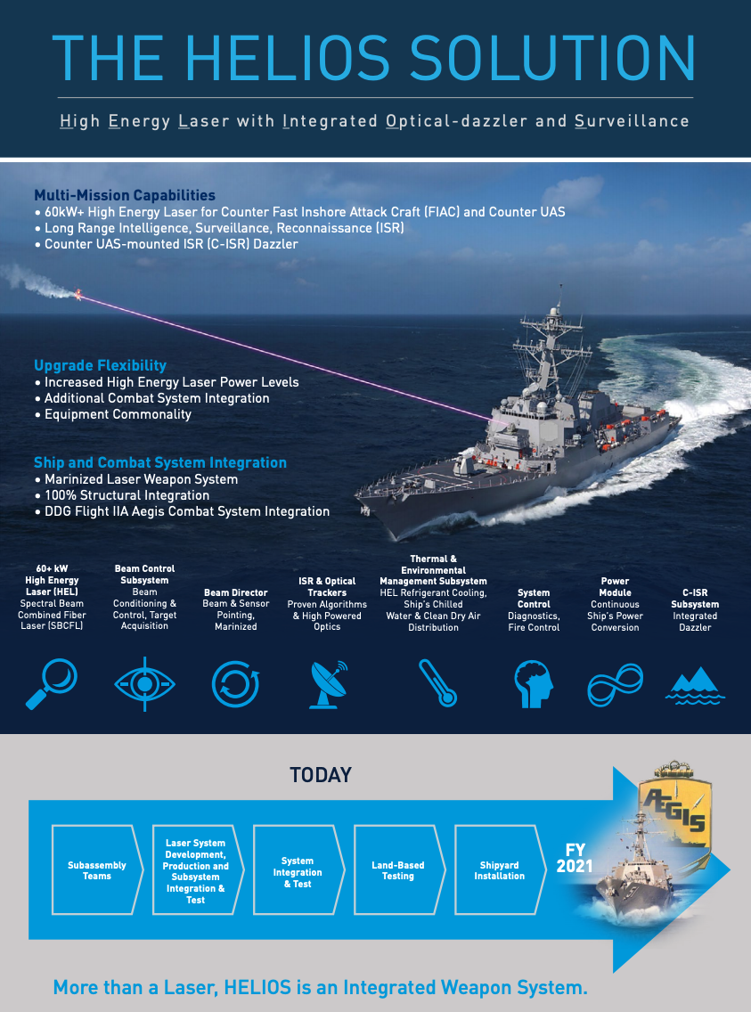 Tyler: So, like HELIOS [High Energy Laser with Integrated Optical-dazzler and Surveillance], on the naval side, it’s an aggressive program. The Navy wants lasers now. They really want the technology. What will this system be able to do that, say the LaWS system that went on the amphibious sea base about six or seven years ago, what will the new system be able to do that LaWS couldn’t? What type of leap are we going to be seeing in this new generation of directed energy weapons for naval ships?