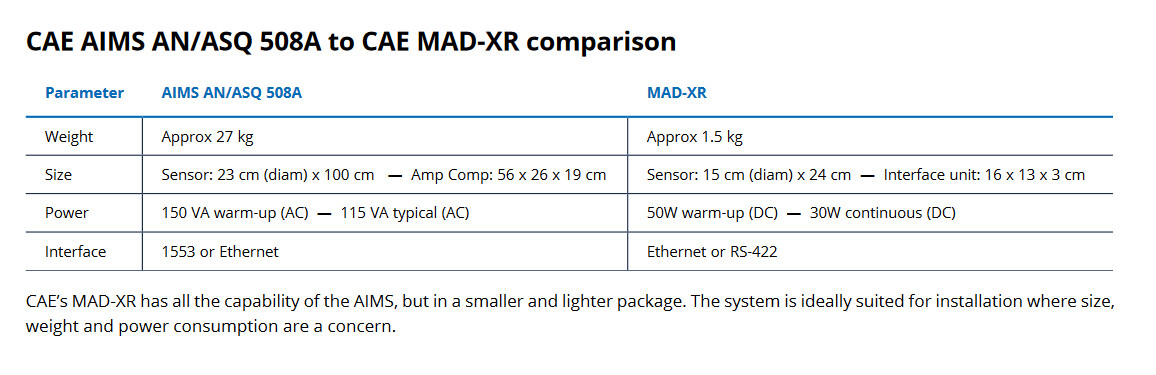 MAD systems of any kind use a magnetometer to detect discrepancies in the Earth’s naturally-occurring magnetic field, which denote the presence of a metal object, such as a submarine. “The range of the MAD system varies, but will generally detect anomalies at approximately 1,200 metres [~1,312 yards],” according to CAE’s MAD-XR product sheet.