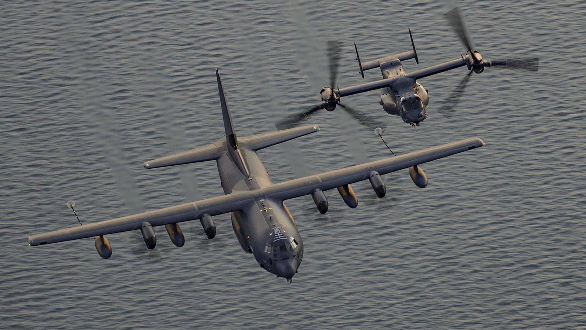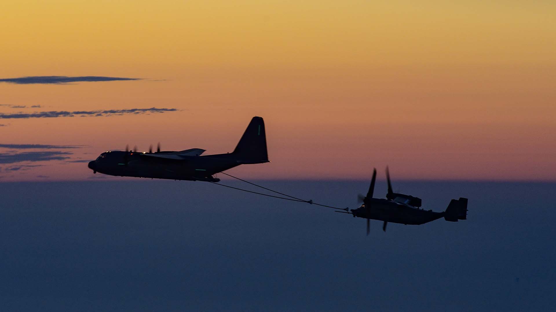 In-flight refueling is a critical factor in maximizing the range of the CV-22Bs. The 67th SOS “Night Owls” at Mildenhall traded their MC-130P Combat Shadows for brand new MC-130J Commando IIs. These support this type of long-range operation by Ospreys, with the Hercules’ providing fuel in flight, whilst also being able to penetrate hazardous areas to conduct infiltration, exfiltration, and resupply of special operations forces via airdrop or landing on austere strips, if required. They can even be used as gas stations on the ground, providing fuel to thirsty aircraft as part of a forward arming and refueling point (FARP), deep inside contested areas.