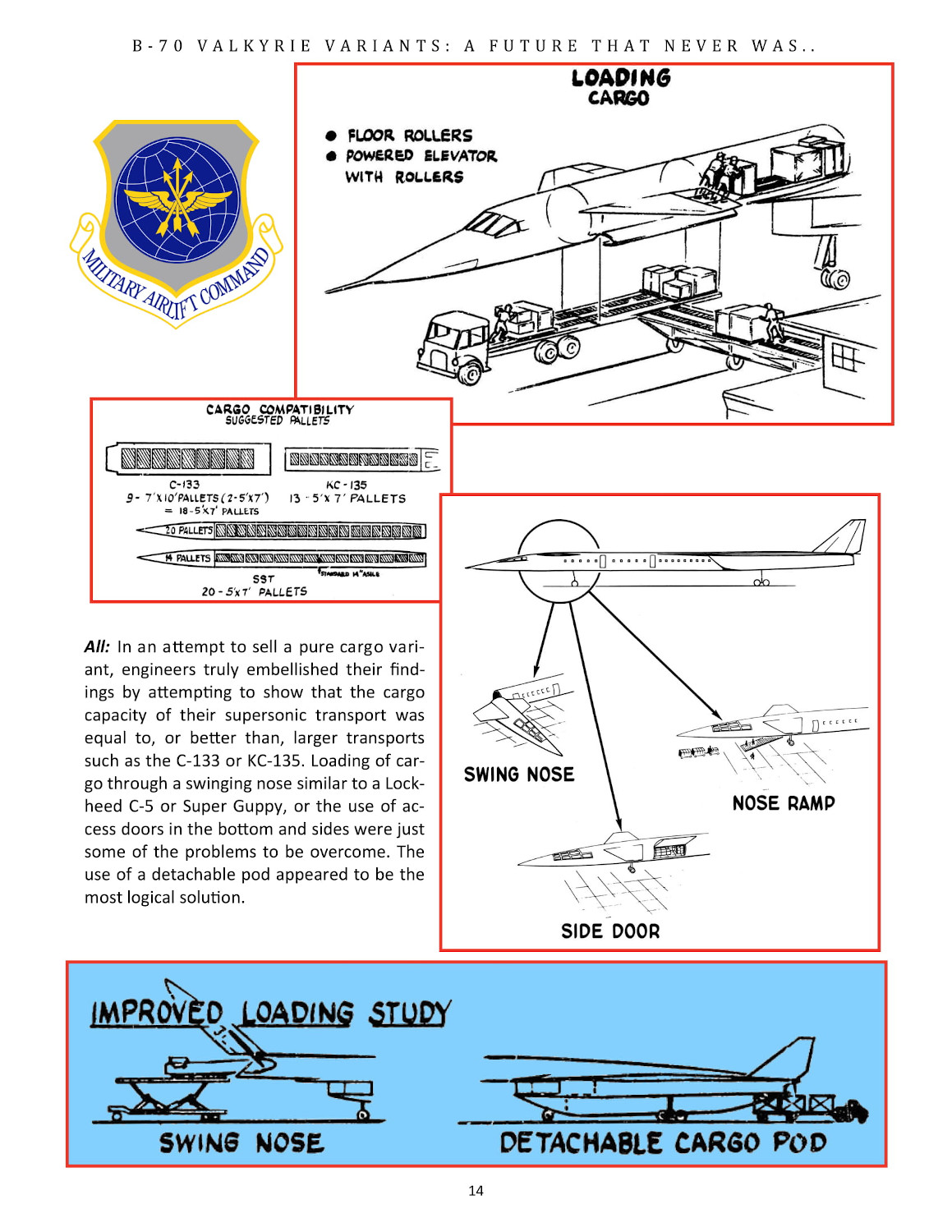 AFMC’s historians note that it’s not clear if the technology at the time would have made it cost-effective to turn the B-70 into an airlifter. “In an attempt to sell a pure cargo variant, engineers truly embellished their findings by attempting to show that the cargo capacity of their supersonic transport was equal to, or better than, larger transports such as the C-133 or KC-135,” the document says. “Loading of cargo through a swinging nose similar to a Lockheed C-5 or Super Guppy, or the use of access doors in the bottom and sides were just some of the problems to be overcome. The use of a detachable pod appeared to be the most logical solution.”