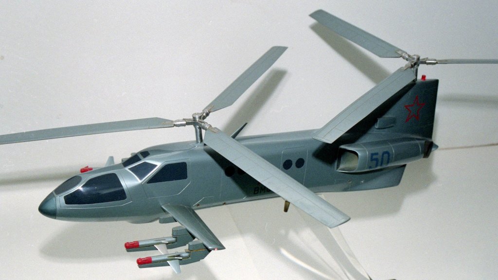 Kamov, however, also proposed a very different and far more radical helicopter design, the V-50, as a “universal helicopter” that would be able to serve both the ground forces and the navy and that was expected to reach a speed of almost 250 miles per hour. In contrast, the now-iconic Mi-8 Hip, which was then entering service as a standard assault transport for the Soviet Army, had a maximum speed of 155 miles per hour.