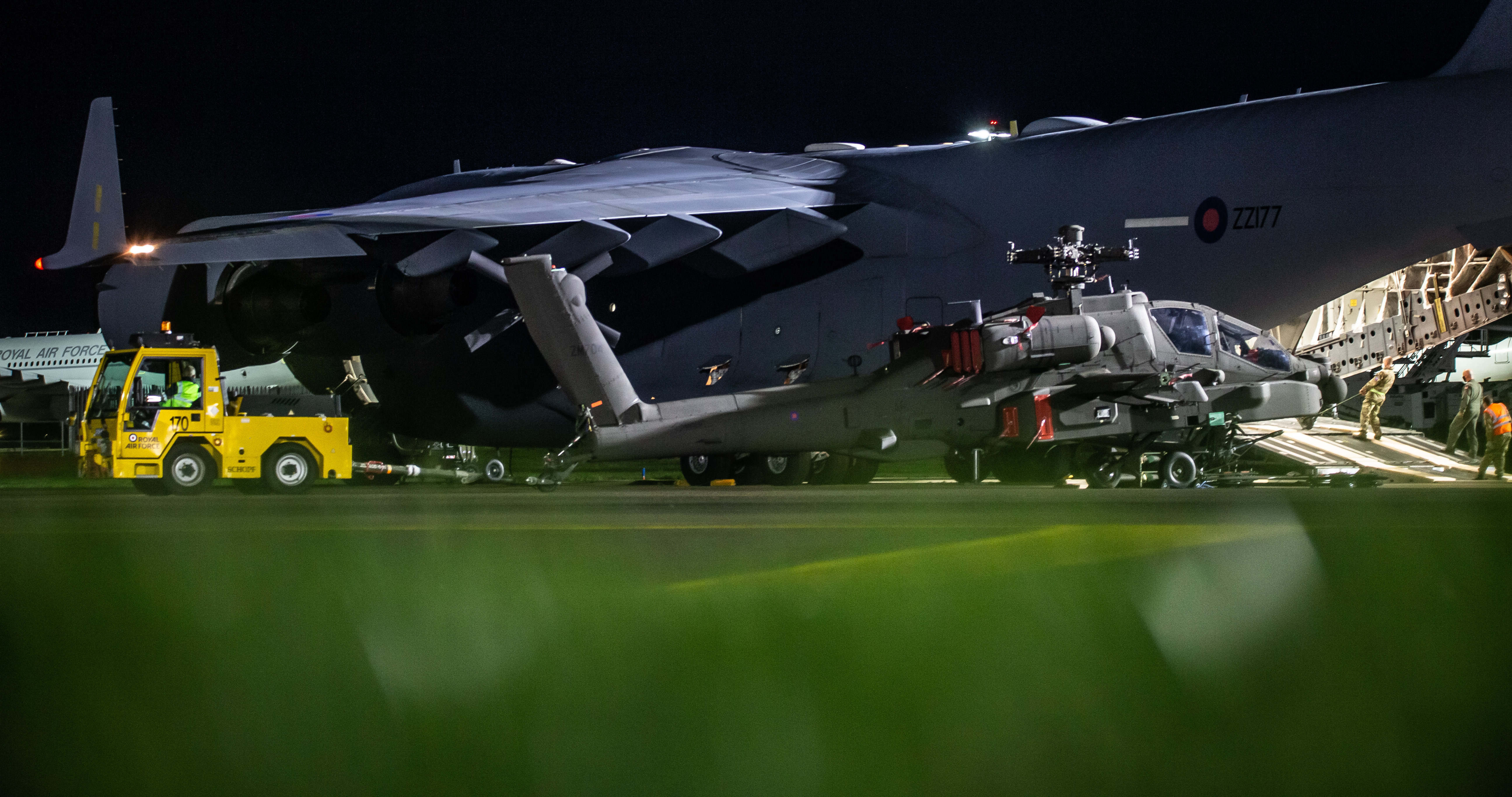 The first two AH-64Es for the British Army were transported by road to Wattisham Flying Station, Suffolk, eastern England, on November 26, 2020, after being flown to the United Kingdom onboard a Royal Air Force C-17 Globemaster III airlifter. They were accompanied by their maintainers, aviation technicians from the Army’s 7 Aviation Support Battalion, Royal Electrical and Mechanical Engineers.