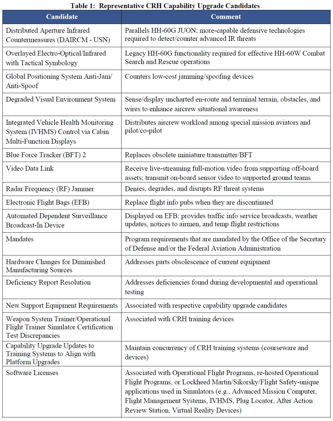 The notice includes 17 prospective “candidates” for upgrades to the HH-60W and associated items, which are seen below.