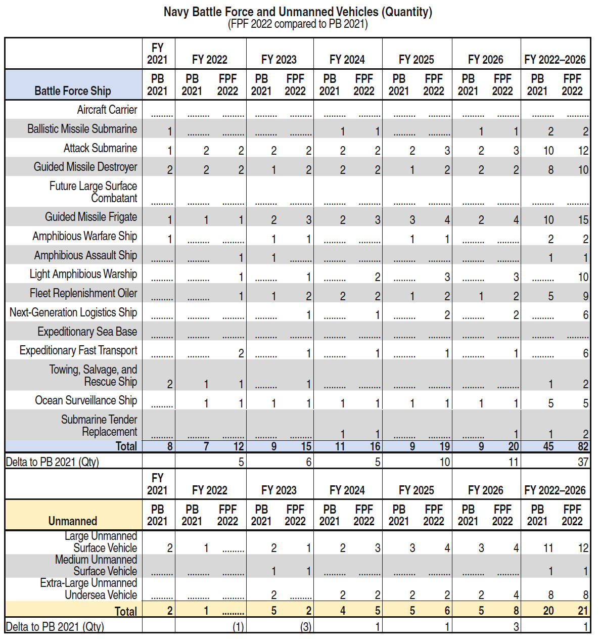 In addition, the plan underscores the Navy’s growing interest in unmanned platforms. The FPF shows an acceleration in the planned purchases of Large Unmanned Surface Vehicles (LUSV) starting in Fiscal Year 2024 and adding an additional LUSV to the total number to be ordered by Fiscal Year 2026.