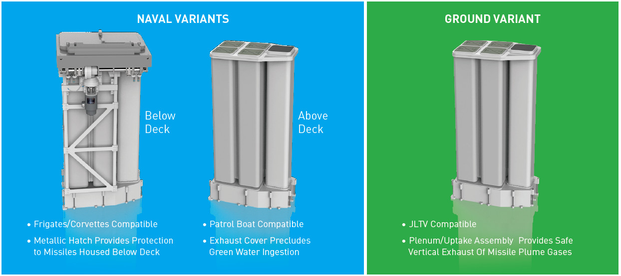 Both designs have what might appear at first glance to be a fifth launch tube, but which is actually an exhaust that diverts the blast of the missiles firing upward, keeping the overall height of the launcher to a minimum. The below deck design features a hatch-type lid to help keep water out of the launcher. The other version simply has covers over each launch tube and the exhaust that break away when the missiles are launched.
