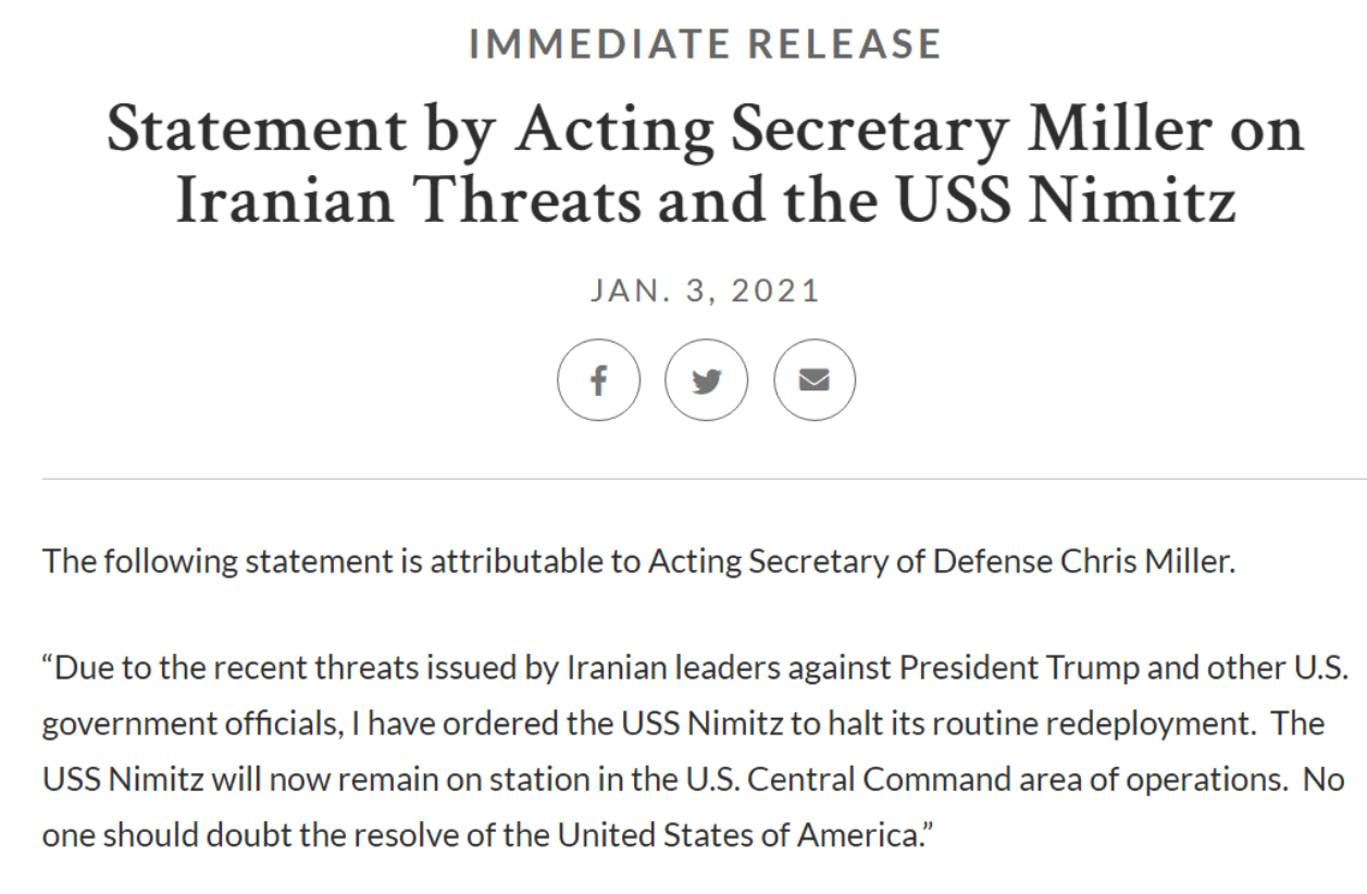 Just two days after the Acting Secretary of Defense Christopher Miller had ordered the supercarrier, USS Nimitz, to head home as a “de-esclatory” gesture toward Iran, the order has been rescinded and the Nimitz Carrier Strike Group is now set to remain in the Middle East until further notice.