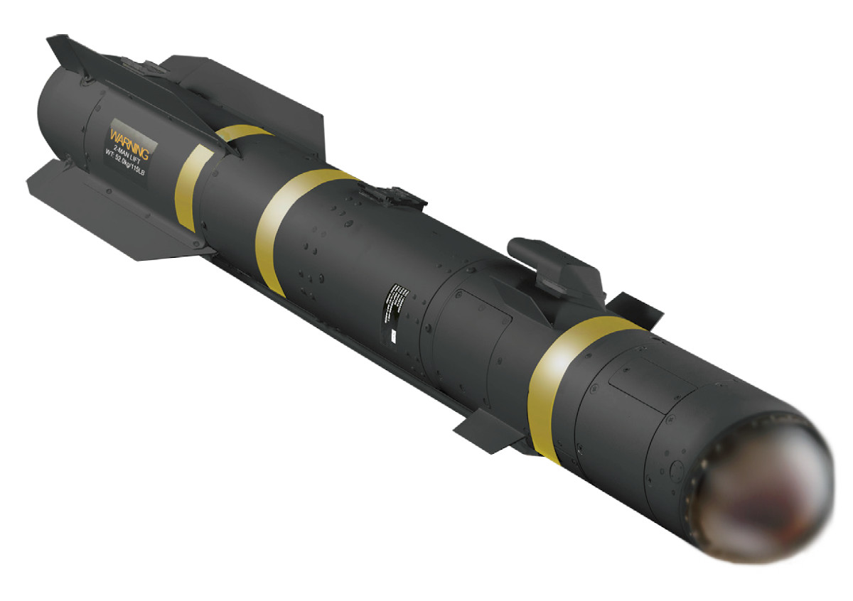 These markings are significant, but more on that in a moment. Also, while this is not a picture of an actual AGM-179A, it is apparently representative enough of the real missile that the dual-mode seeker in the nose is blurred out.