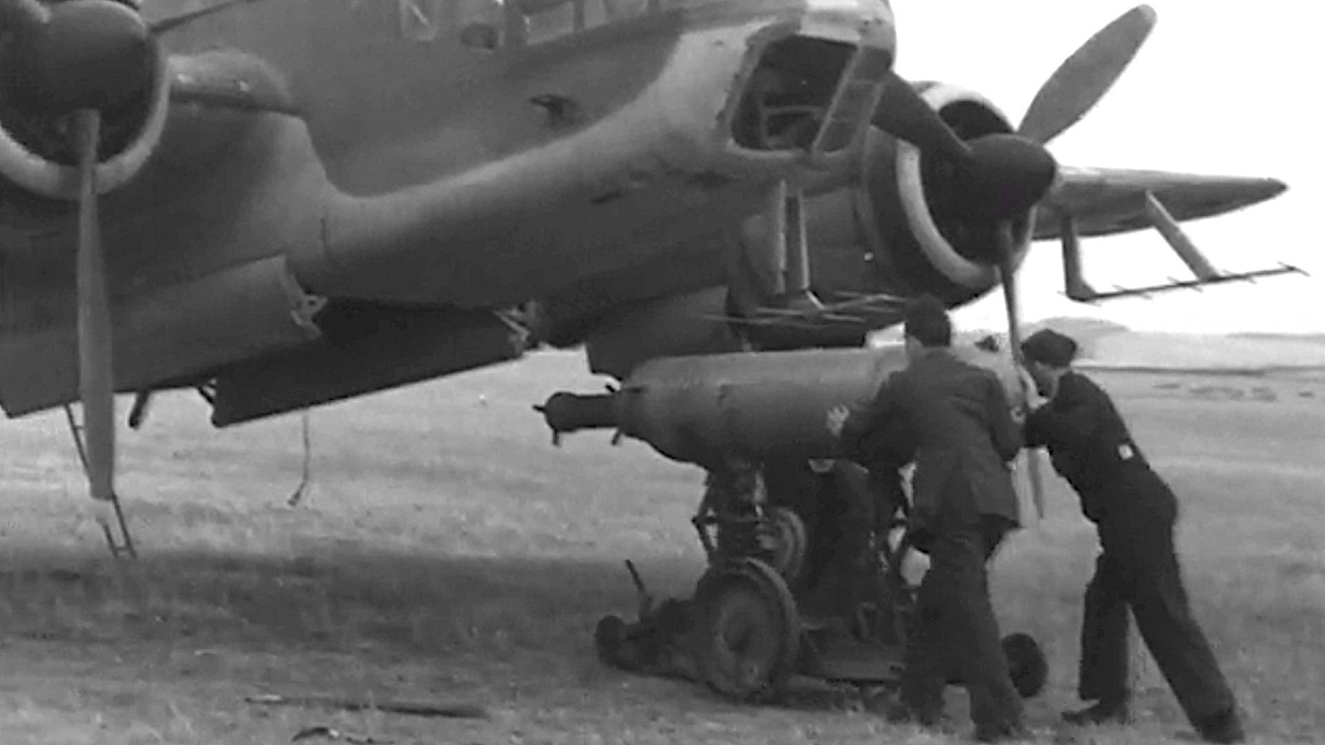 The film, which is three minutes and 35 seconds long, was made by the RAF Film Production Unit and is dated April 1944. It begins with an aerial sequence showing a Bristol Beaufort torpedo bomber carrying the flamethrower, passing at one point over an airfield. It then shifts to a clip where we see the ground crew using a trolley to transport what appears to be a purpose-made cylinder containing the fuel for the flamethrower to the aircraft. Using a mechanism built into the trolley, the ground crew raise the cylinder into the bomb bay of the aircraft.