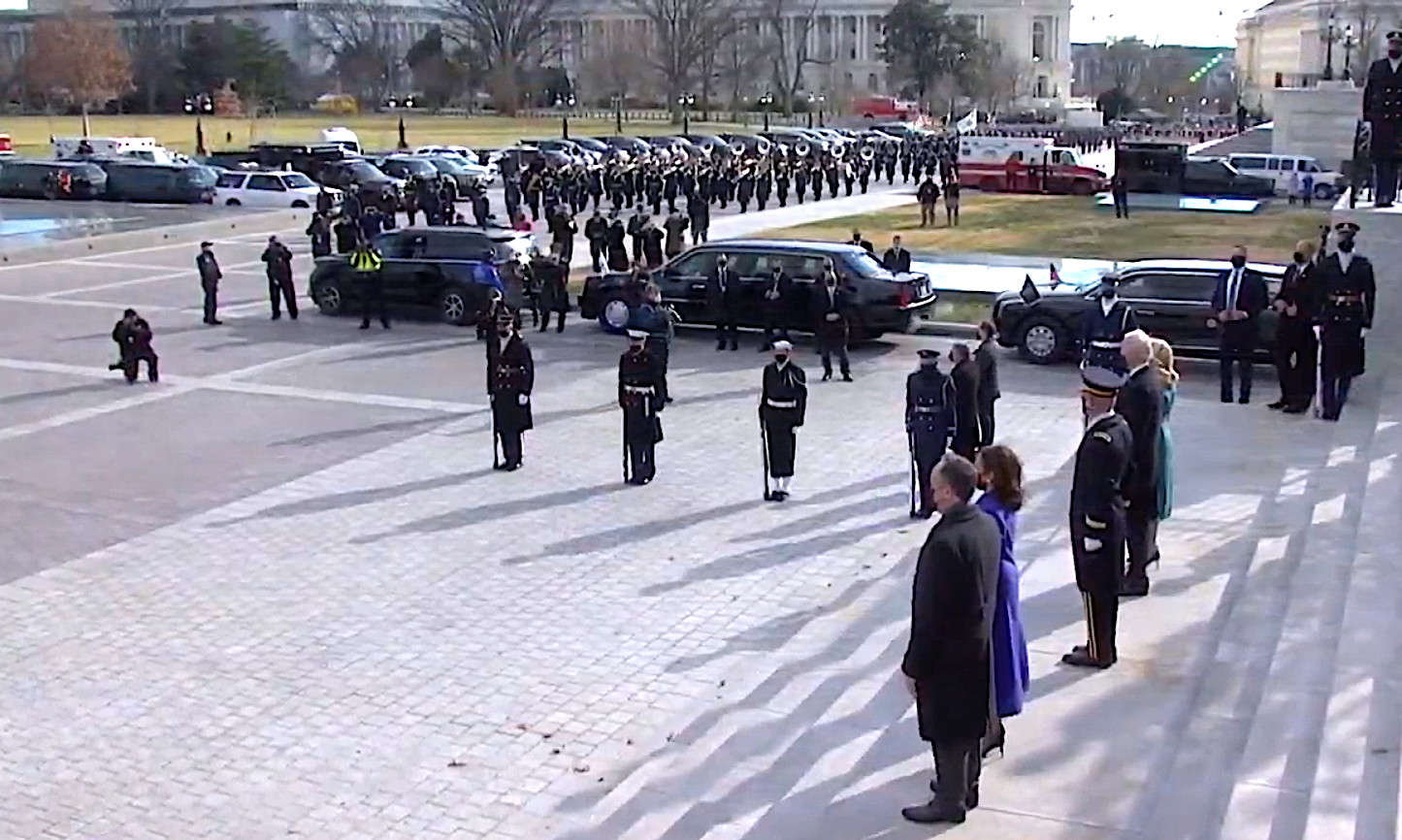 Afterward, the motorcade returned to downtown D.C. to take part in a more muted procession toward the White House. The bulk of the traditional parade was transformed into a virtual “Parade Across America.”