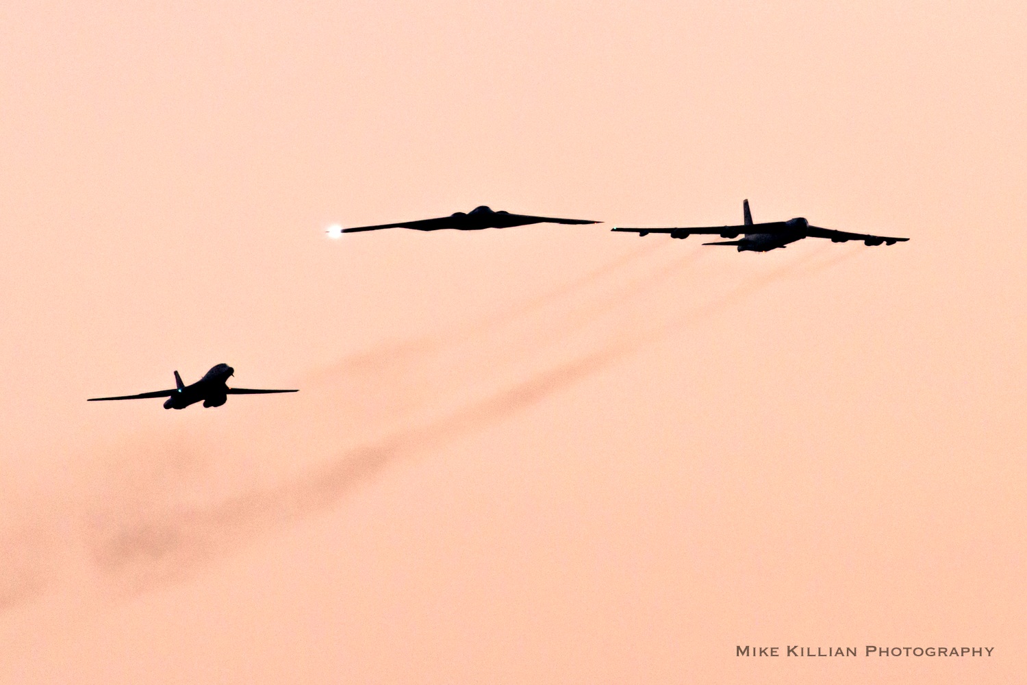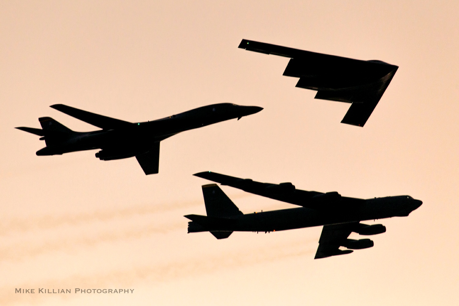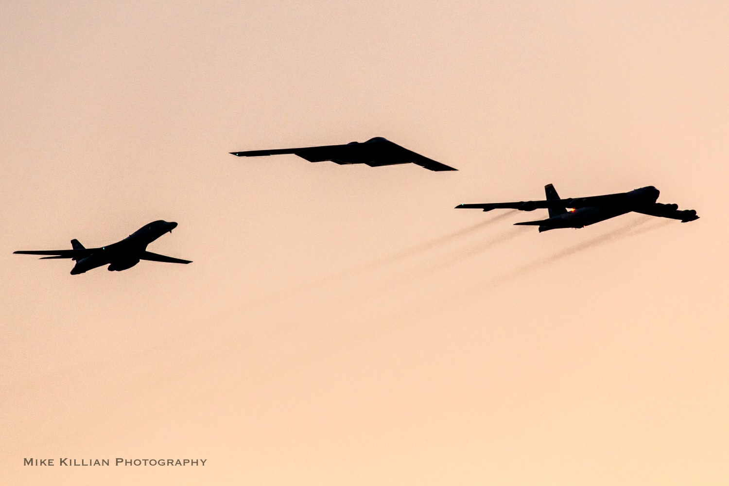 The bomber trio formation was so interesting not just because it represented the Air Force’s bomber inventory, but also because the airframes are so radically different from one another. The B-1B is a swing-wing, sleek design with powerful F101 turbofan engines that are capable of afterburning. The B-52 is the classic—a huge-winged, lumbering, eight-engined Cold War beast of an aircraft. Then you have the B-2, a pure flying wing and stealthy design. It is one eclectic threesome whose silhouettes underscore just how different they are. While they have been shot together over the years from time to time, they have never done so under such high-profile circumstances.