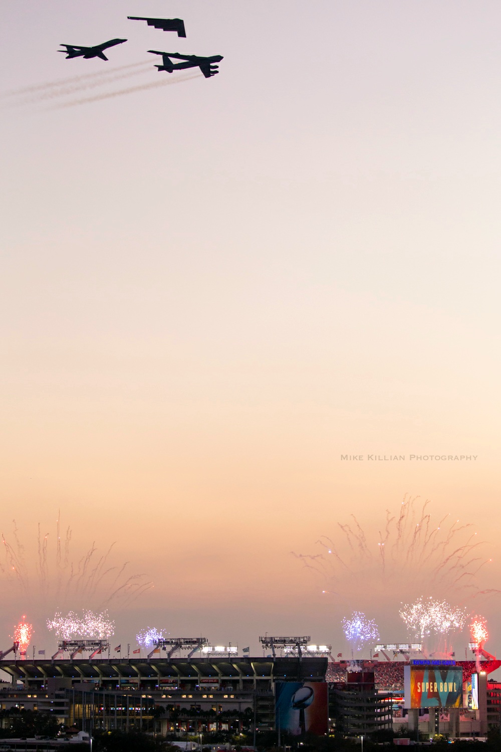 Some come for the plays. Some come for the halftime show. Some come for the commercials. And yes, some are mainly in it for the opening flyover. This year, aviation nerds got a unique offering for the Super Bowl—Air Force Global Strike Command provided one each of their bombers—a B-52, a B-1, and a B-2. It would be the first bomber trio flyover for a big game. Although it wasn’t heavily promoted, the aircraft’s designations also add up to 55 (B-1 + B-2 + B-52=55), which was ideal for Super Bowl LV, or 55. The three bombers, with the B-2 in the lead, hit their mark exactly as Eric Church and Jazmine Sullivan reached the National Anthem’s crescendo, with the jets roaring by overhead, silhouetted against the Tampa Bay twilight. While the footage of the flyover was a little abrupt during the broadcast, one aviation photographer—our friend Mike Killian—captured the moment impeccably.