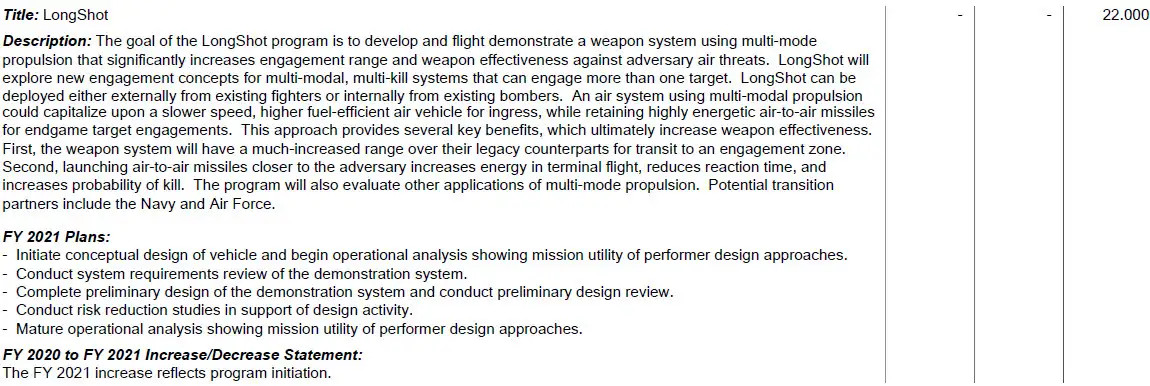 “An air system using multi-modal propulsion could capitalize upon a slower speed, higher fuel-efficient air vehicle for ingress, while retaining highly energetic air-to-air missiles for endgame target engagements,” the entry for LongShot in the Fiscal Year 2021 budget proposal further explained. “First, the weapon system will have a much-increased range over their legacy counterparts for transit to an engagement zone. Second, launching air-to-air missiles closer to the adversary increases energy in terminal flight, reduces reaction time, and increases probability of kill.”