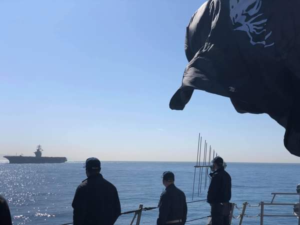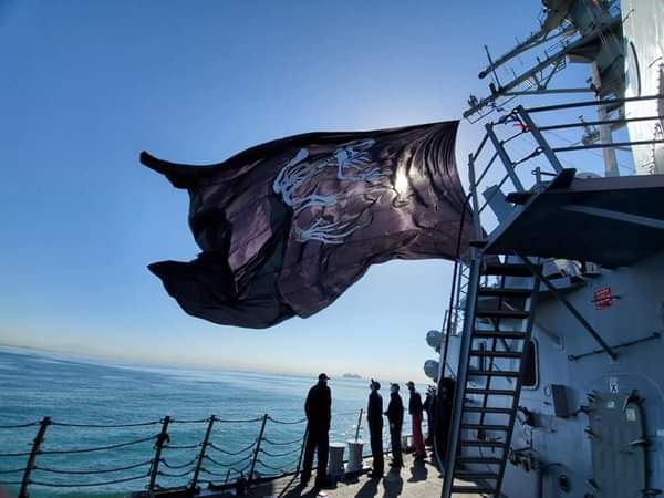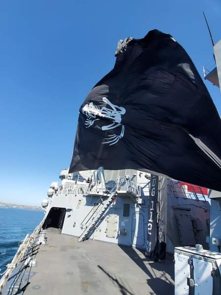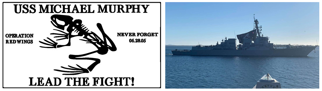 We have been informed that the USS Michael Murphy flies the giant American Flag when entering port and the giant Bone Frog when leaving port. I think we may get a display of the latter soon!