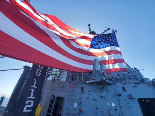 Just before 1:00 PM local time, the DDG-112 proudly paraded its way to the naval base on the southeast end of the bay with an absolutely gargantuan—as in it could not possibly be any bigger—American Flag billowing in the wind off its port side. Twitter user @CJR1321 was able to capture it and shared it with our friends over at @warshipcam, who published it on their Twitter page. During the destroyer’s high-profile transit, it passed very close by an oncoming Independence class Littoral Combat Ship, with its massive flag blotting out a huge part of the passing vessel. In still images and in video it is an awesome and bold display to behold. It must have gotten a lot of smiles for those who saw it in person.