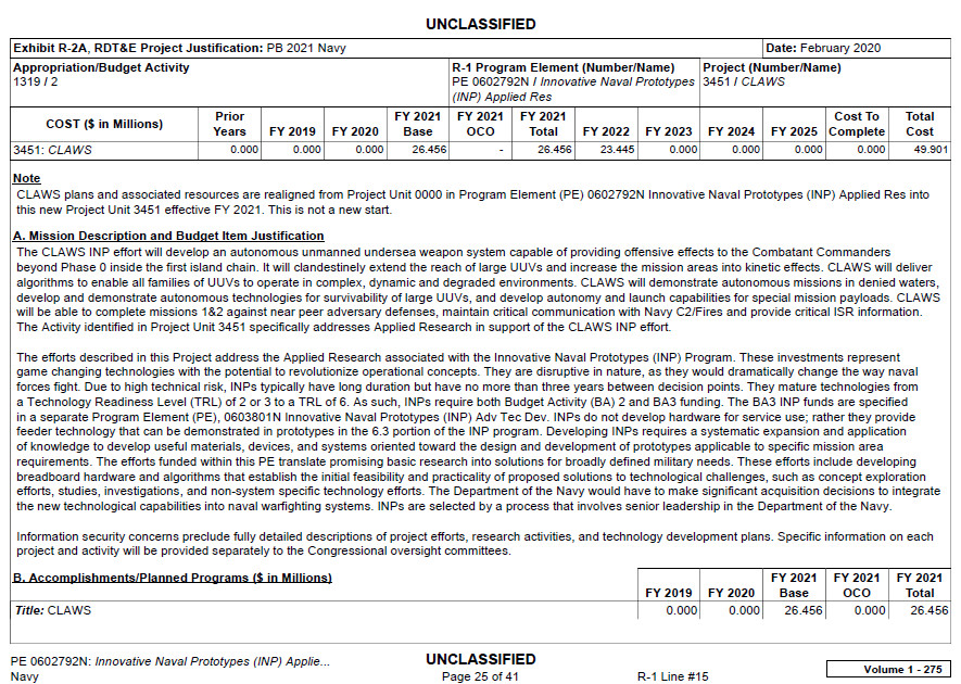 The third line of effort the Navy planned to break out of the larger “Unmanned and Autonomous Systems” funding line is called CLAWS, but no definition is given for what that acronym means. However, the plan for work on this program in the 2021 Fiscal Year is described as follows:
