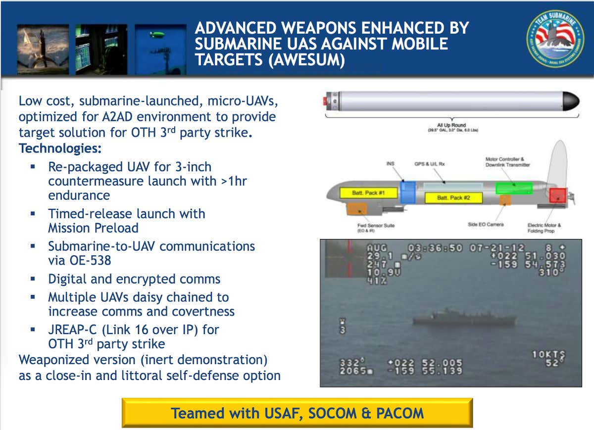 “Consider a submarine-deployed unmanned aircraft as a flying periscope able to dramatically extend our submarines’ organic sensor range, provide target-quality sensor data back to the submarine, or to a joint force capability, and enable Harpoon and Maritime Strike Tomahawk missile engagements,” Navy Rear Admiral Blake Converse, Commander, Submarine Force, U.S. Pacific Fleet, said in an online presentation last year.