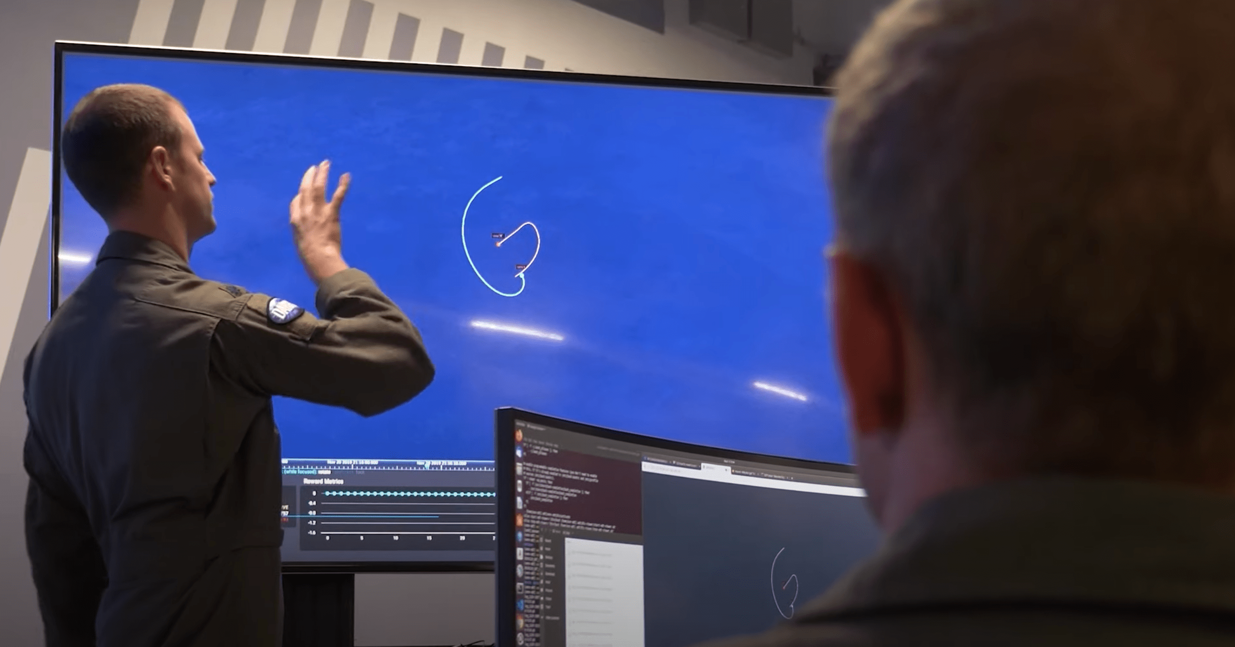 Using a simulation environment designed by APL, Scrimmage 1 involved a demonstration of 2-v-1 simulated engagements with two blue force (friendly) F-16s working collaboratively to defeat an undisclosed enemy red air (enemy) aircraft.