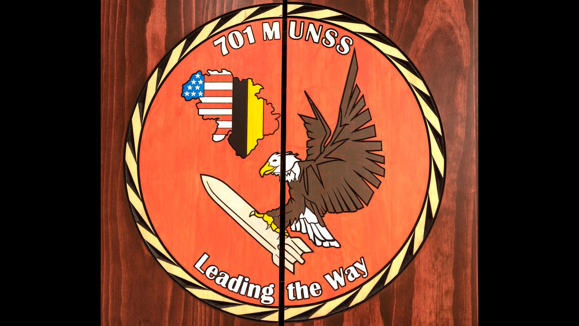 In addition to the nuclear-armed eagle, the circular logo also has a silhouette of Belgium filled in with representations of the American and Belgian flags, as well as the text “701 MUNSS” at the top and “Leading The Way” at the bottom. This is not the 701st’s official unit insignia, which also includes the phrase “Leading The Way,” but has a red lion, “an honorary symbol of dedication” that “reflects the unit’s link with its host location,” placed over a star similar to the one in the official NATO logo at its center.
