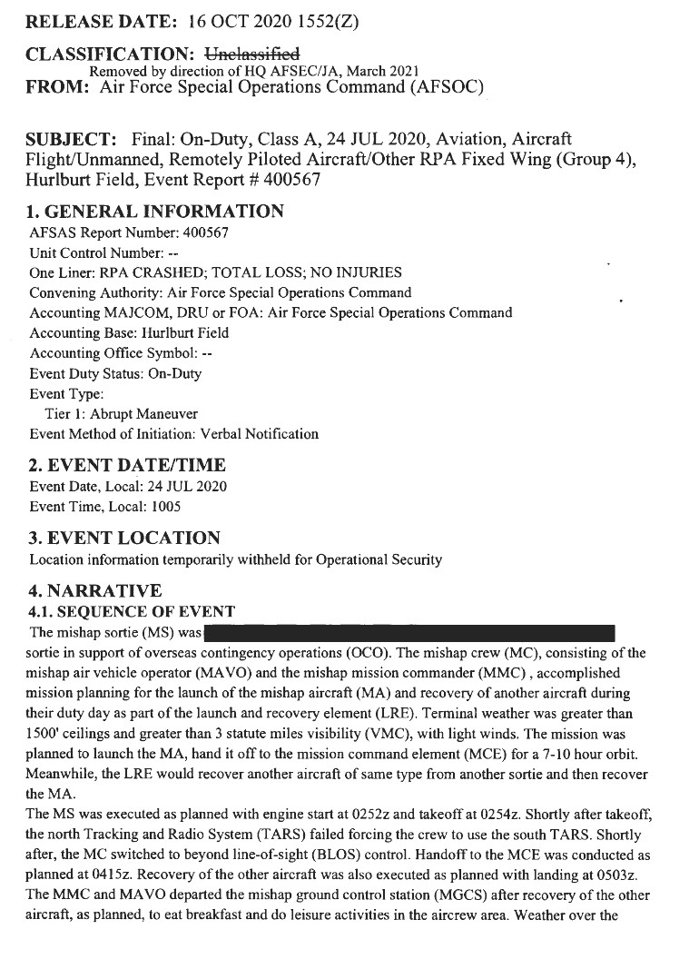 had been first to disclose that a mishap involving what was then described as an unidentified “remotely piloted vehicle,” or RPA, had occurred at an “undisclosed location” overseas on July 24, 2020. That outlet had obtained a spreadsheet of all Class A and B mishaps the Air Force had suffered during the 2020 Fiscal Year, which ended on Sept. 30, 2020. There had been speculation at the time that the crashed drone could have been an RQ-170 Sentinel, though the spreadsheet said that the unmanned aircraft belonged to Air Force Special Operations Command (AFSOC). Units assigned to Air Combat Command (ACC) are the only ones publicly known to fly the stealthy RQ-170.