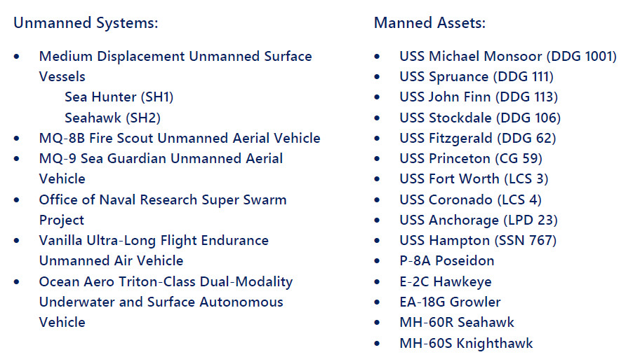 The Navy also provided a list of the major manned and unmanned participants in the experiment. On the manned side, on the surface, the Zumwalt class stealth destroyer USS Michael Monsoor will join four Arleigh Burke class destroyers, a Ticonderoga class cruiser, an example of each one of the two subclasses of Littoral Combat Ship (LCS), a San Antonio class landing platform dock amphibious warfare ship, and a Los Angeles class attack submarine. In the air, there will be P-8A Poseidon maritime patrol planes, E-2C Hawkeye airborne early warning and control aircraft, EA-18G Growler electronic warfare jets, and MH-60R/S Seahawk helicopters.