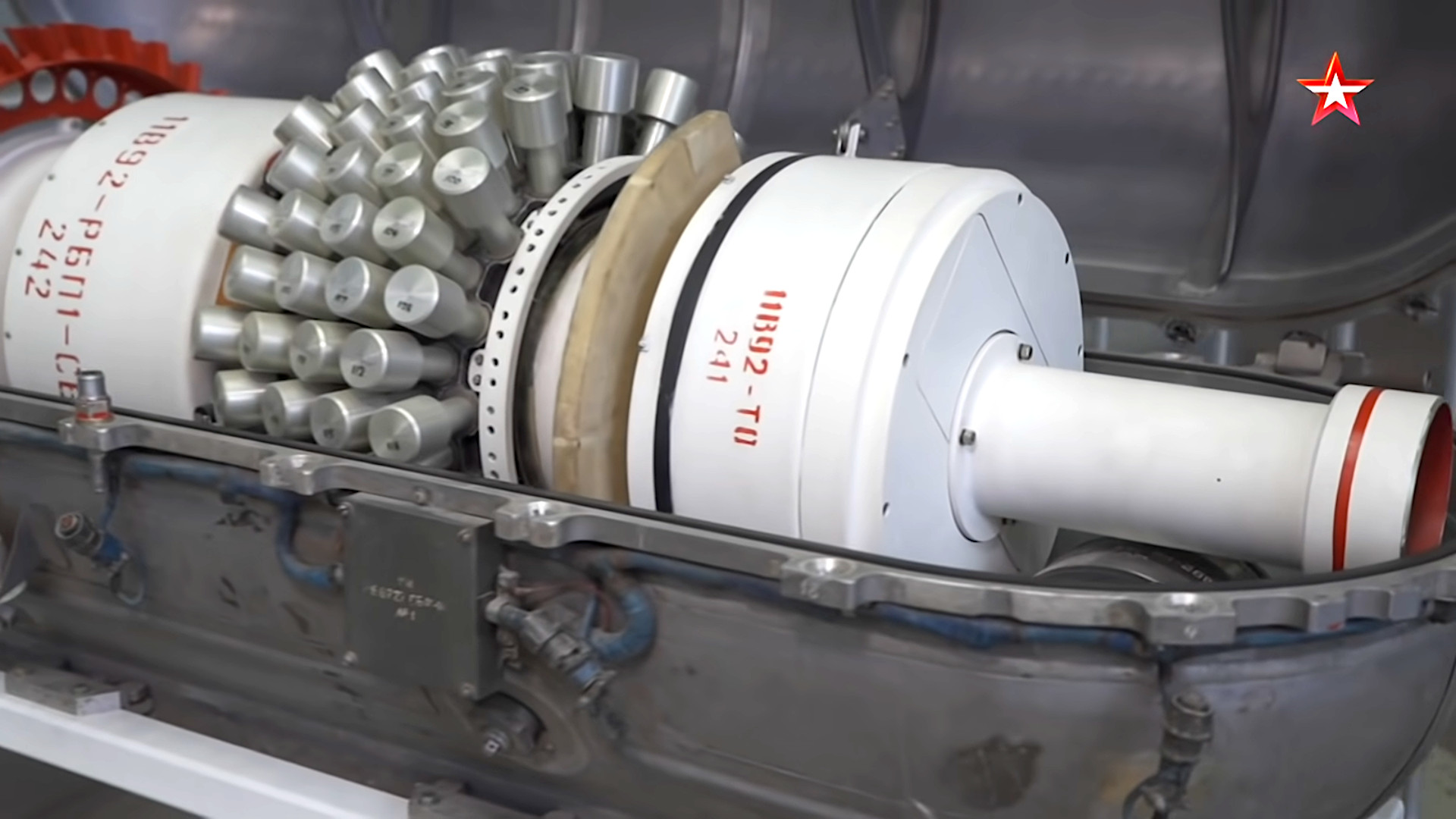 By far, the propulsion-warhead section is the most interesting part. Outwardly, it has what appears to be a circular array of small, grenade-like charges, which one would imagine would unleash a cloud of shrapnel that would particularly dangerous to other objects in the vacuum of space. However, these projectiles are actually solid and are designed to act as hard-kill interceptors, destroying whatever they hit through the sheer force of the impact, according to Anatoly Zak. More interestingly, Smirichevsky made clear to TV Zvezda that this portion of the weapon was also used to propel it in some fashion, though he did not elaborate.