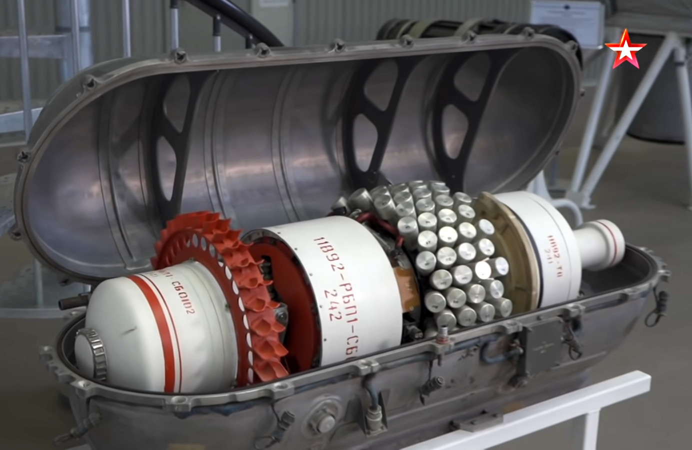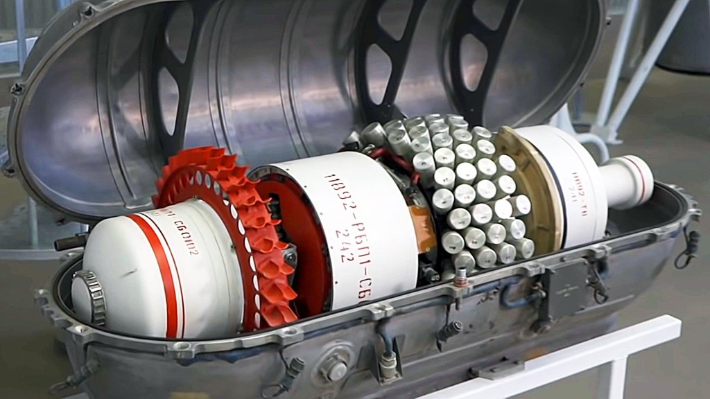 As to the weapon itself, Leonard Smirichevsky, the current head of NPO Mashinostroyenia, described it to TV Zvezda‘s reporter as having four major components. The base of the system is a solid-fuel rocket motor, which is then attached to a spin-stabilization system consisting of a rotating wheel with blade-like fins. There there is a hybrid propulsion-warhead section, which we will come back to in a moment, followed by a proboscis-like radar seeker at the front.