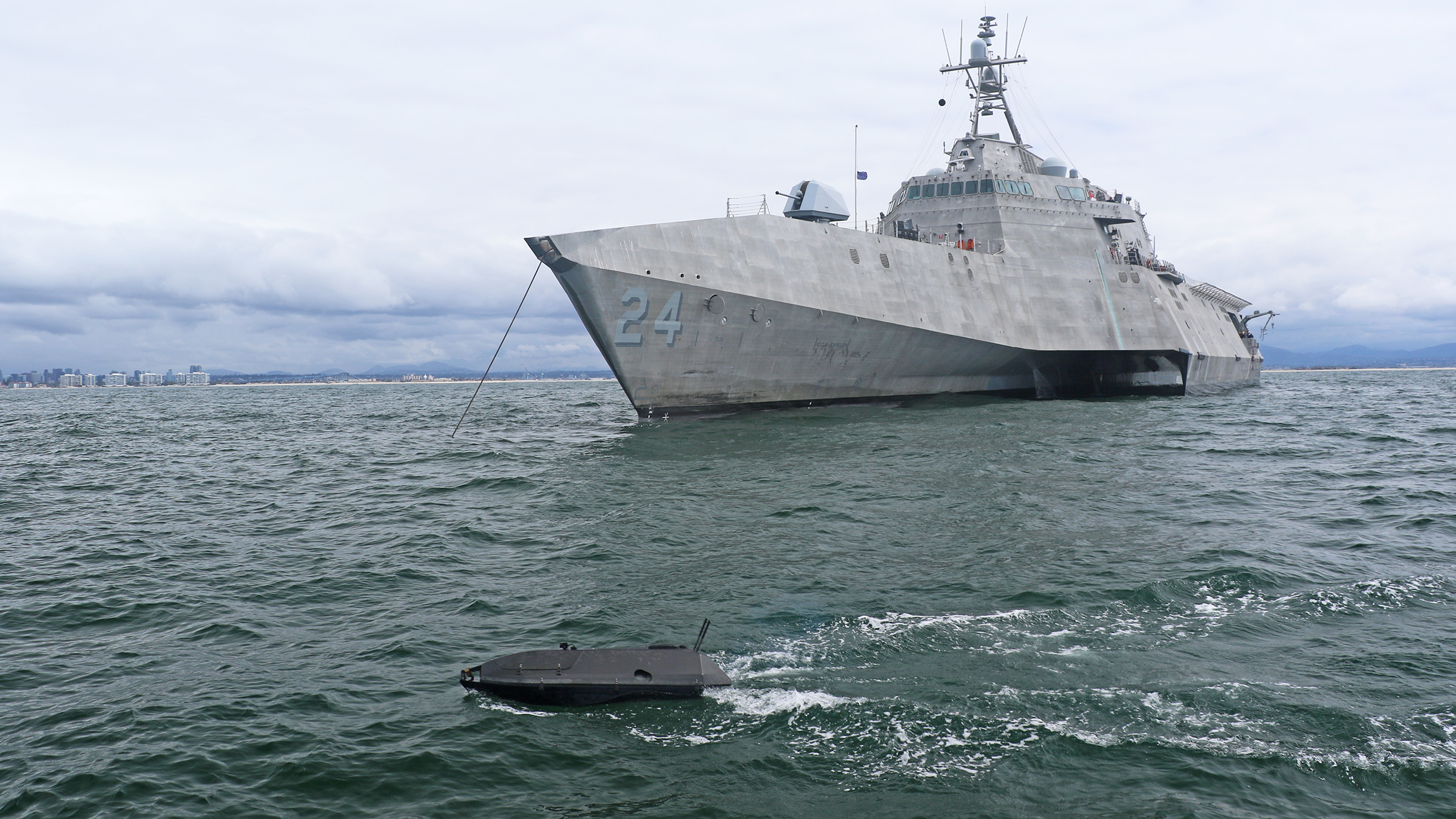 Photos released yesterday show the diminutive ADARO cutting through the waves off the bow of the newest Littoral Combat Ship USS Oakland, LCS-24, while the warship is at anchor. Another view shows the drone operating in the same U.S. Pacific Fleet exercise with the San Antonio class amphibious transport dock USS Anchorage (LPD-23) underway in the background.