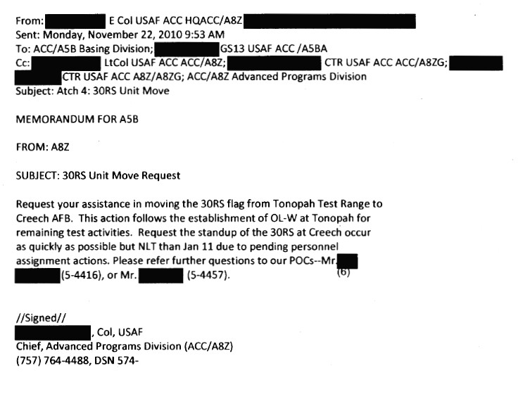 A separate Email, dated Nov. 22, 2010, sent from a Colonel within Air Combat Command’s Advanced Programs Division, abbreviated ACC/A8Z, and a civilian official at that command’s Basing Division, or ACC/A5B, among others, identifies the entity that was stood up at Tonopah to take over RQ-170 testing as Operating Location W (OL-W). The name of the official who sent this Email and those of all of the recipients have been redacted.