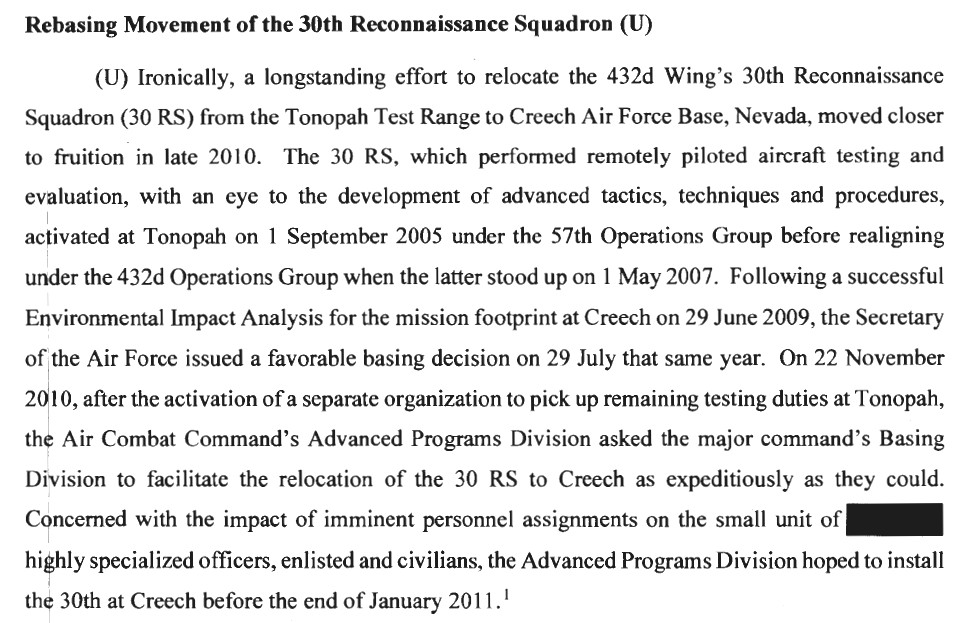 The service itself said that “ironically” it was its own bureaucracy that finally got things going. “Concerned with the impact of imminent personnel assignments on the small unit of [redacted] highly specialized officers, enlisted and civilians, the Advanced Programs Division hoped to install the 30th at Creech before the end of January 2011,” the 432nd Wing history explained.