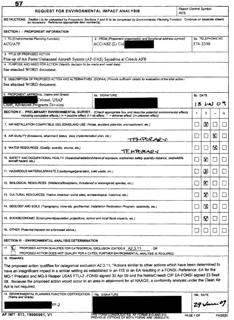 Interesting, parts of the 2009 environmental impact analysis that the Air Force released to The War Zone, seen below, say that a driving factor for the proposed move from Tonopah to Creech was that unit, referred to in that report only as an “Air Force Unmanned Aircraft Systems (UAS) Squadron,” was expected to “see an increase in equipment and personnel over the next year,” growing to approximately 175 individuals, 100 of which would be military personnel, while the remaining 75 would be contractors.