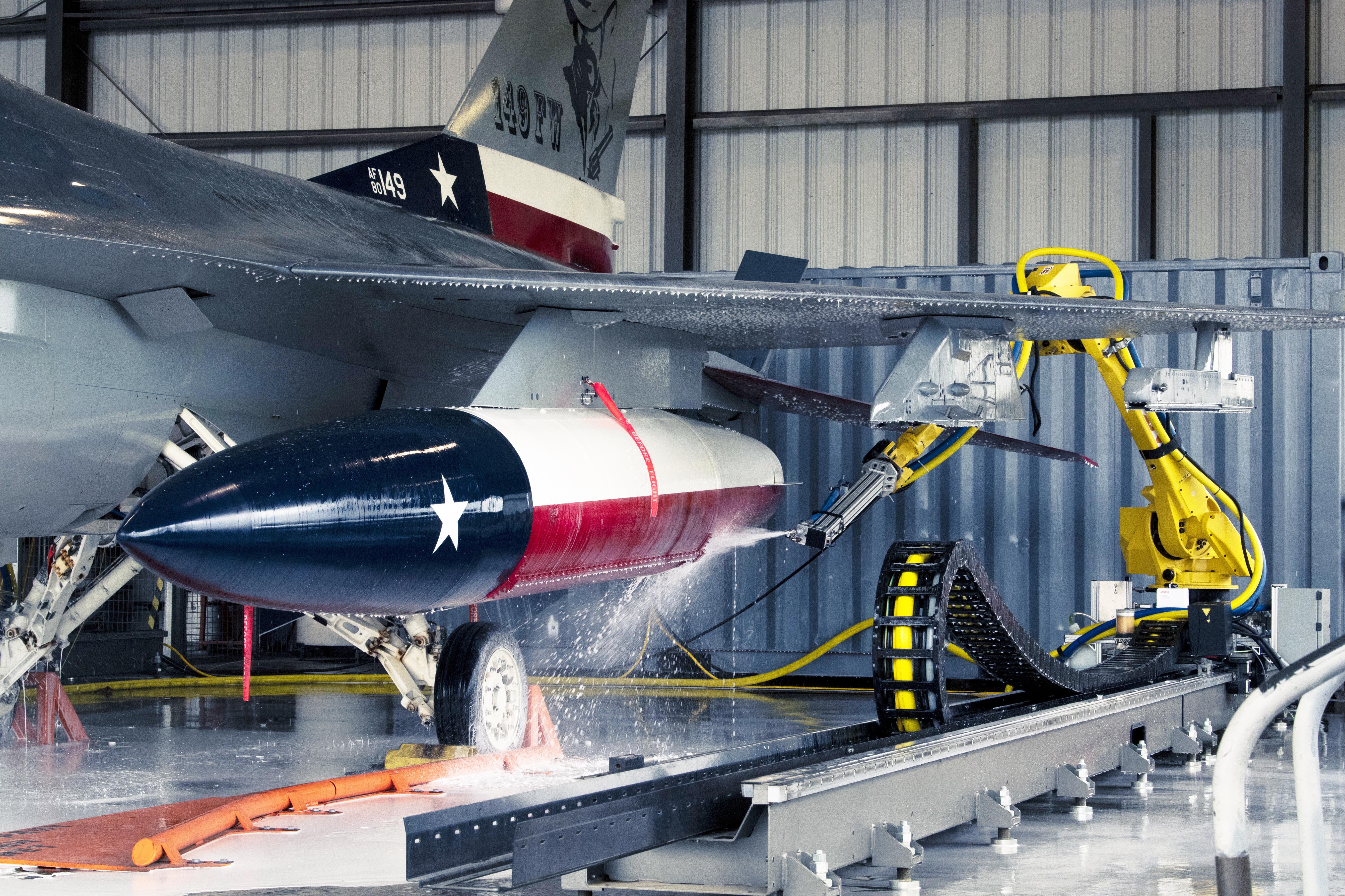 The days of crew chief using long-handled brushes to clean those hard-to-reach areas of the F-16 — not to mention other aircraft — could be numbered.