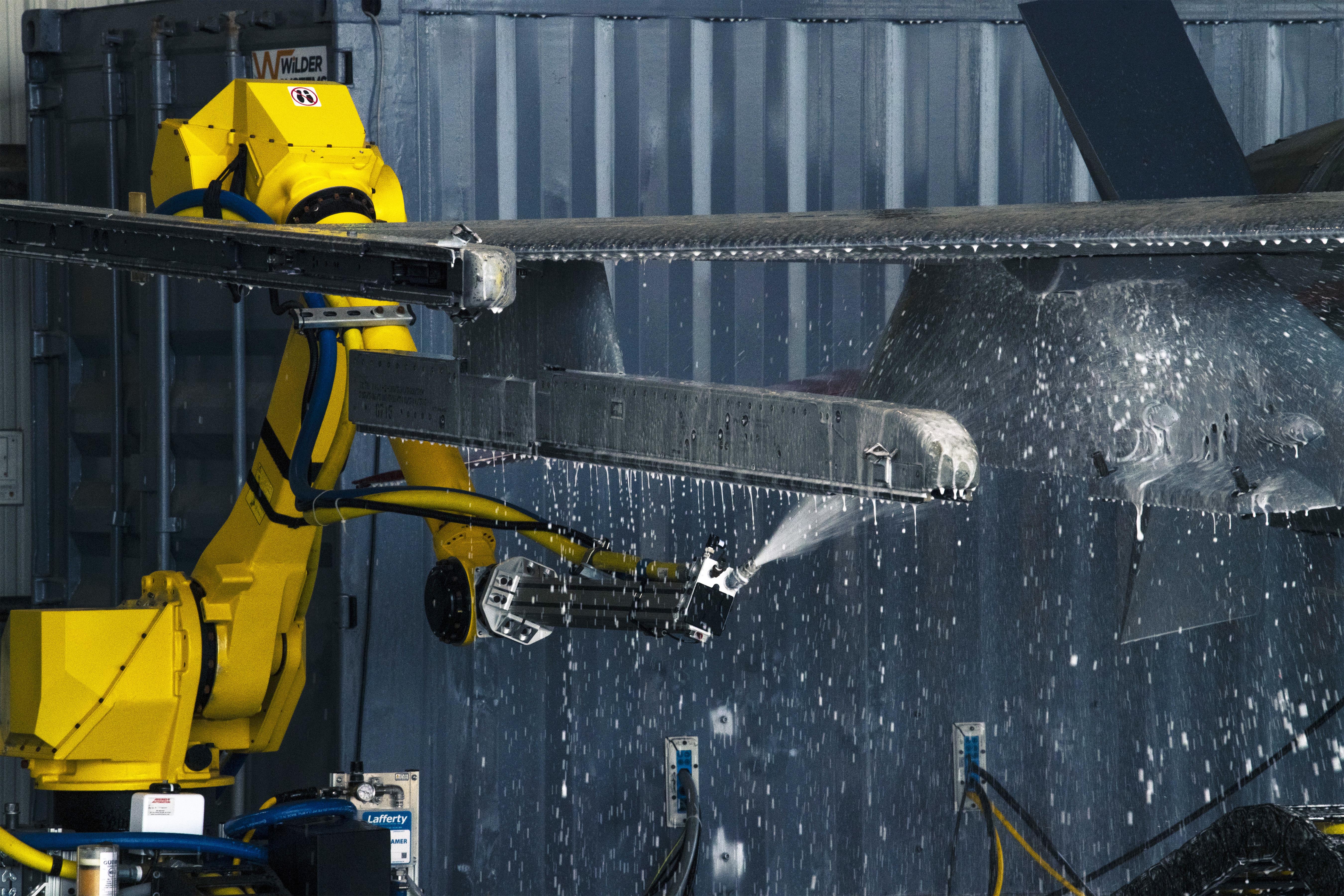 The Wilder Systems solution actually leverages technology previously developed for robotic drilling in commercial aircraft manufacturing and converts these components and subsystems into an automated washing system. The main changes have involved the development and addition of robot end-effectors to provide the water and soap spray, waterproofing of the robots themselves, and a robot motion path, which is dependent on the type of aircraft to be cleaned.