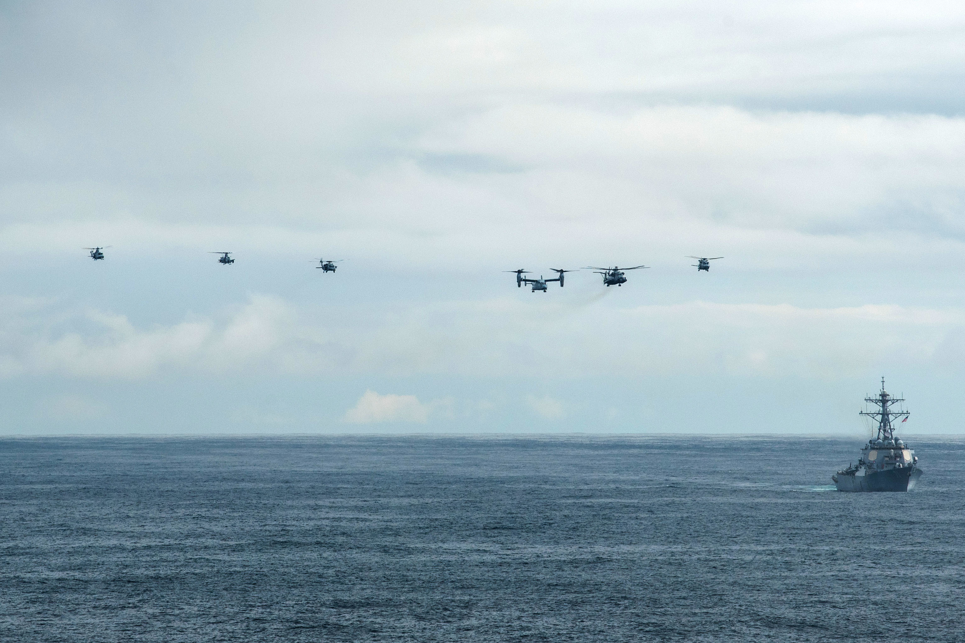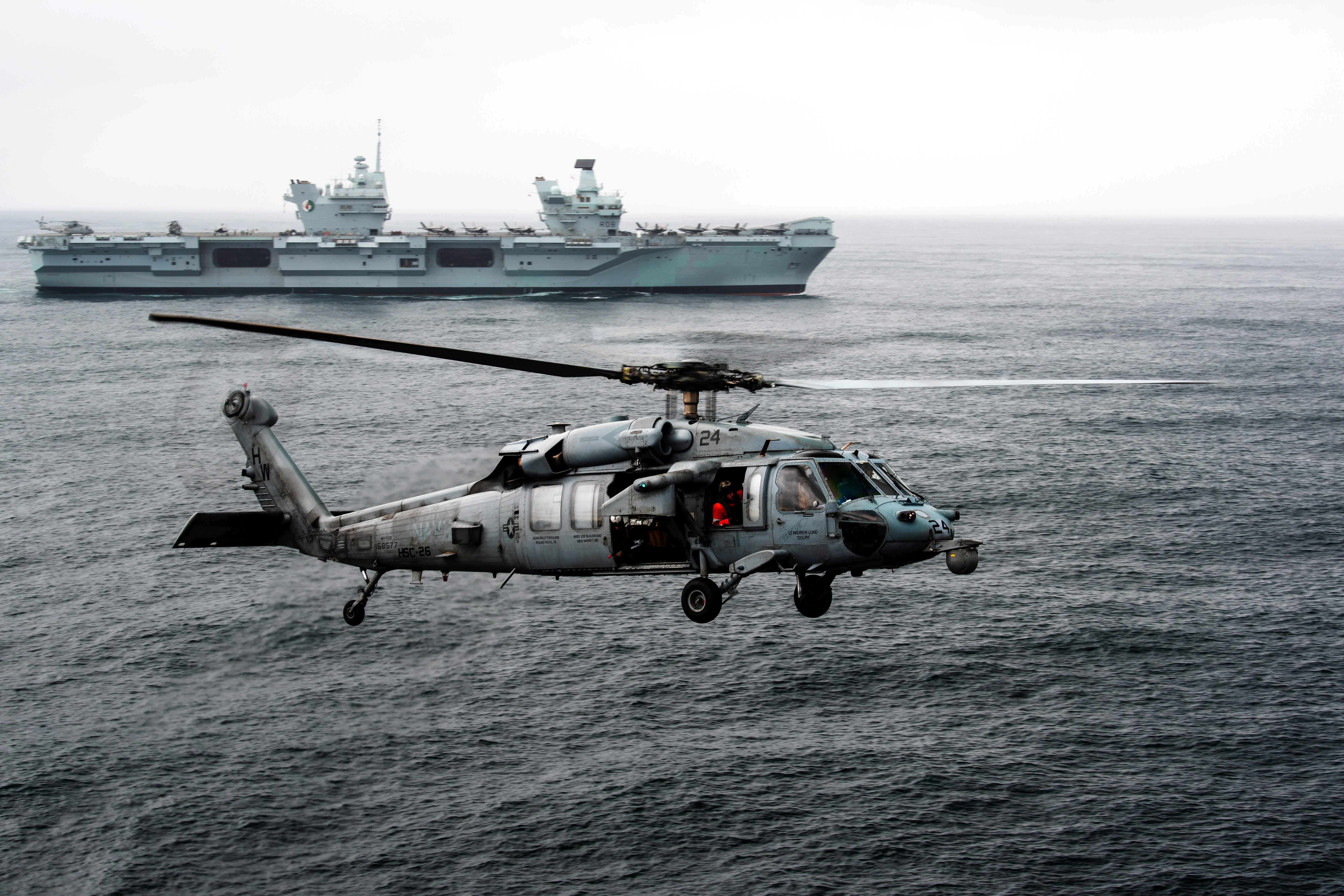 Embarked aircraft on HMS Queen Elizabeth and attached to other Royal Navy vessels included F-35B stealth fighters from both the Royal Air Force’s No 617 Squadron, the “Dambusters,” and from Marine Fighter Attack Squadron (VMFA) 211, the “Wake Island Avengers,” Wildcat HMA2 multirole helicopters from 815 Naval Air Squadron (NAS), anti-submarine warfare and airborne early warning and control Merlin HM2 helicopters from 820 NAS, and Commando Merlin helicopters from 845 NAS.