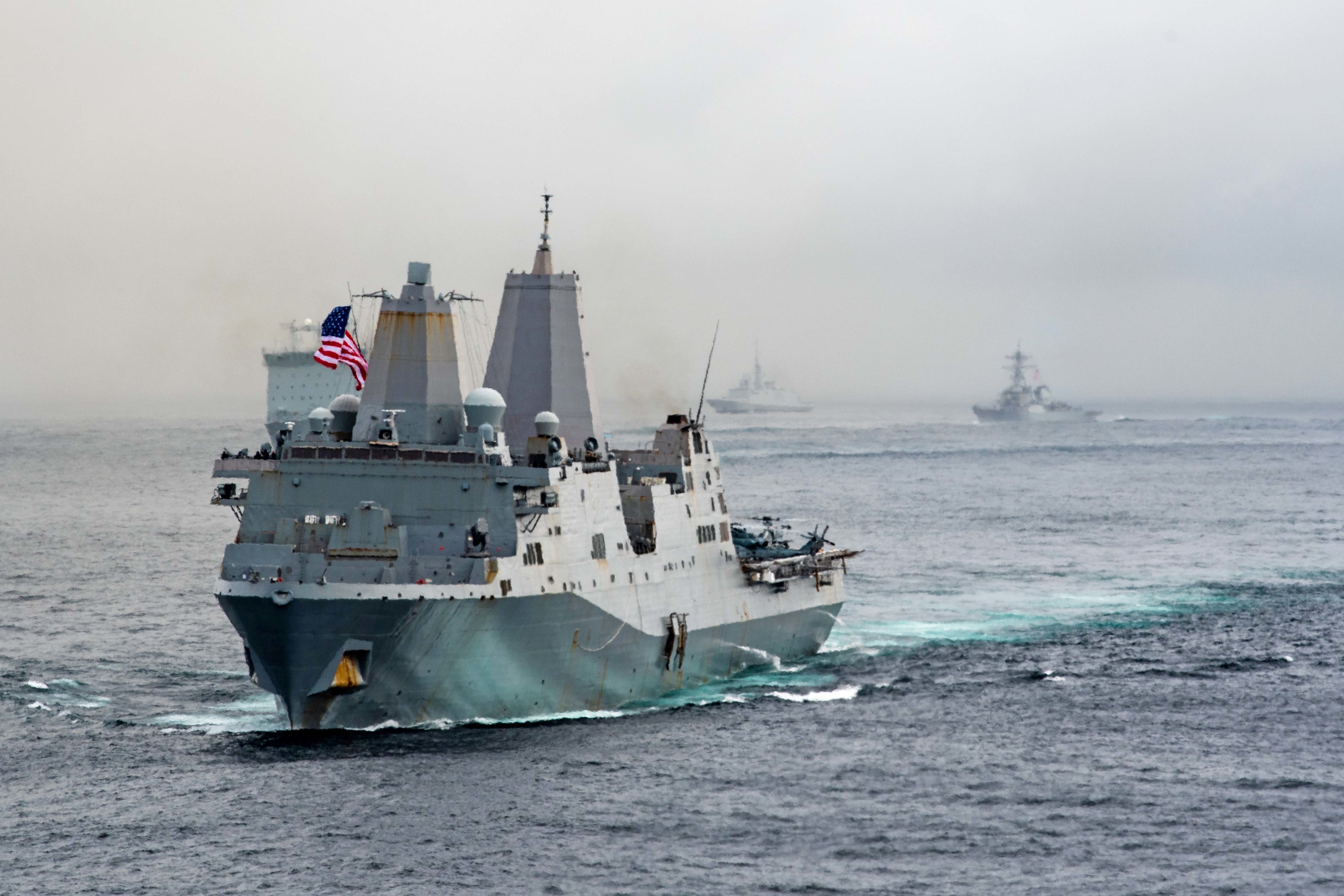 Also involved in these maritime drills, which were dubbed Exercise Ragnar Viking, were vessels from the French Navy and the Royal Norwegian Navy — an NH90 naval helicopter from one of those forces is also visible in the image above. The centerpieces of the maneuvers, however, were HMS Queen Elizabeth, which is working up for its first operational deployment within Carrier Strike Group 21 (CSG21), and the U.S. Navy’s Wasp class amphibious assault ship USS Iwo Jima. That amphibious assault ship is the flagship of the IWOARG, which also includes other elements of Amphibious Squadron 4, the Harpers Ferry class dock landing ship USS Carter Hall and the amphibious transport dock ship USS San Antonio, as well as the embarked 24th Marine Expeditionary Unit (MEU).