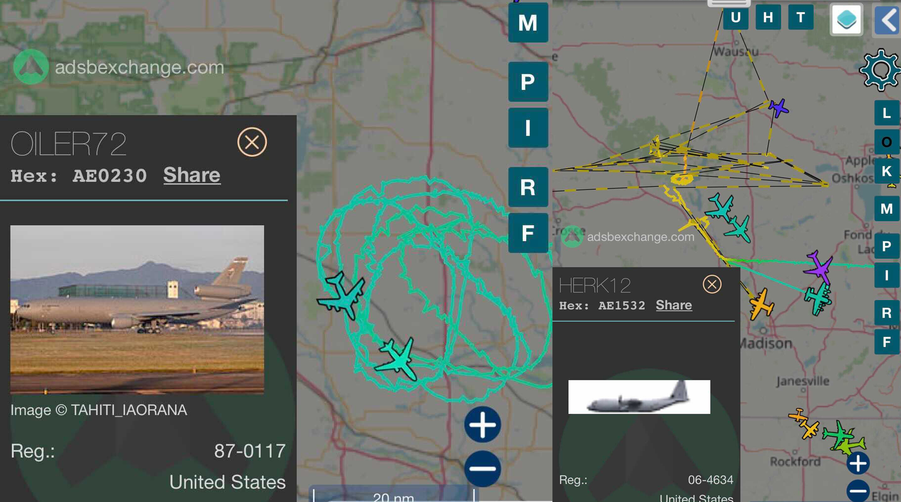 I was listening to airmobile exercise MOBILITY GUARDIAN. About 20 minutes ago, two aircraft had a mid-air collision. VIPER 12 reported that he had a collision with his flight lead and was departing to the west. VIPER 11 referenced as the “unlucky jet” and HERK 12 took to the scene to take command for the “downed jet” situation. OILER 72 (a KC-10) took control shortly after so HERK 12 could depart. Those aircraft are visible on ADSB. Crash coordinates listed as Bullseye 190 @ 186, so if bullseye is Duluth, that would put the crash in the VOLK WEST MOA.