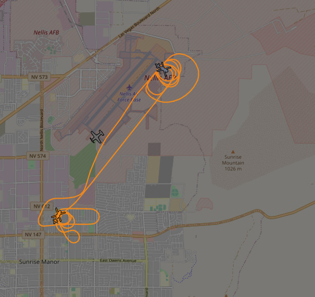 At the time of writing, online flight tracking data available through ADS-B Exchange shows a Las Vegas Metropolitan Police Department Hughes 530 helicopter orbiting the reported area of the crash and subsequent fire. Other data showed that a Department of Energy Bell 412 helicopter had been flying in the same area following the reported crash, before returning to Nellis, and may have been one of the first aircraft on the scene.