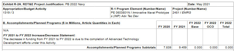With regards to the INP Advanced Technology Development account, the budget documents say that “the decrease in funding from FY 2021 to FY 2022 is due to the completion of Advanced Technology Development efforts under this Activity.” This line item also says that the objectives for this program in the 2022 Fiscal Year are “N/A” and does not make any mention of future work funded through other portions of the budget.