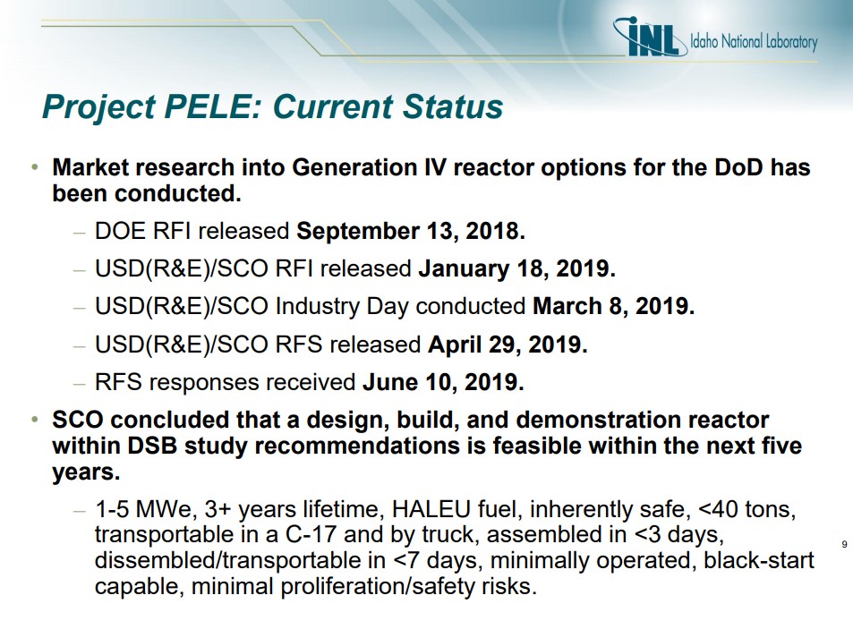 In March of this year, X-Energy and BWX were awarded contracts to begin final design work on Pele prototypes. A two-year design-maturation period will now ensue, after which one of the two may be selected to build and actually demonstrate their design. Along with those industry partners, Project Pele is being developed with insights from the Department of Energy (DOE), the Nuclear Regulatory Commission, the National Nuclear Security Administration, the U.S. Army Corps of Engineers.