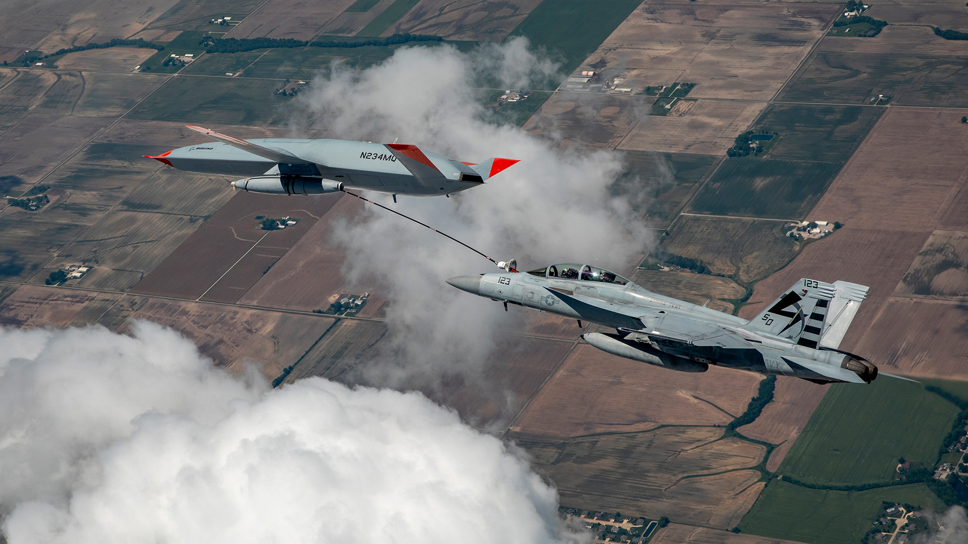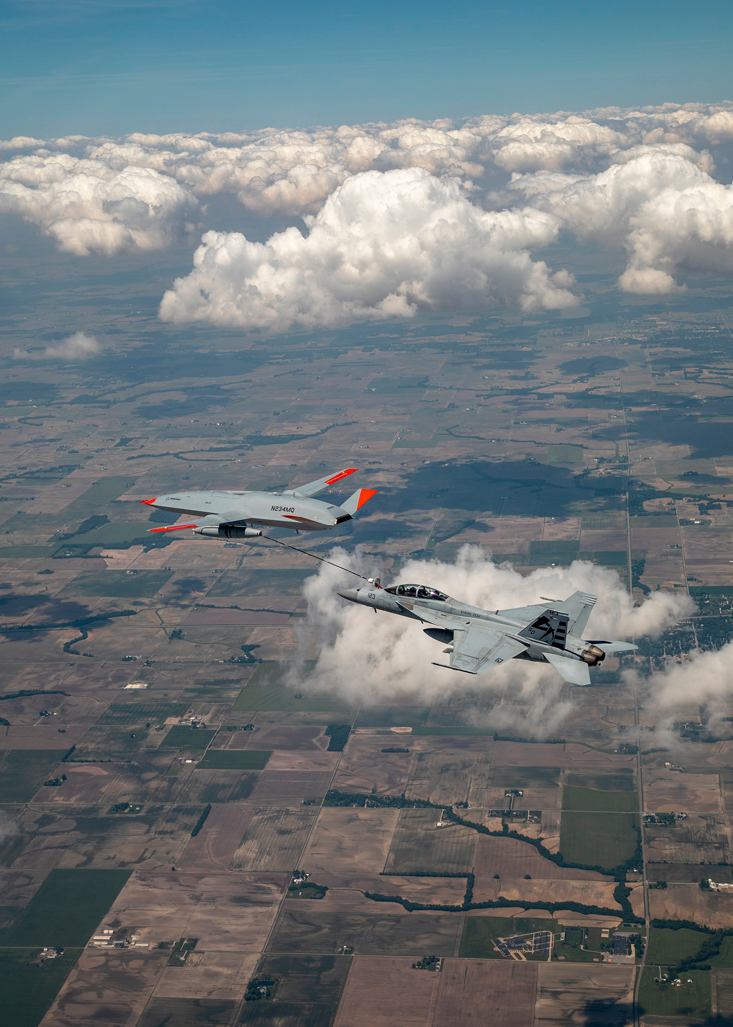 At a joint Boeing and U.S. Navy media round table, Captain Chad Reed, program manager for the Navy’s Unmanned Carrier Aviation program office (PMA-268), and Dave Bujold, Boeing MQ-25 program director, provided some more details about the historic June 4 refueling sortie, involving the T1 test article for the MQ-25 program and an F/A-18F from Air Test and Evaluation Squadron Two Three (VX-23).