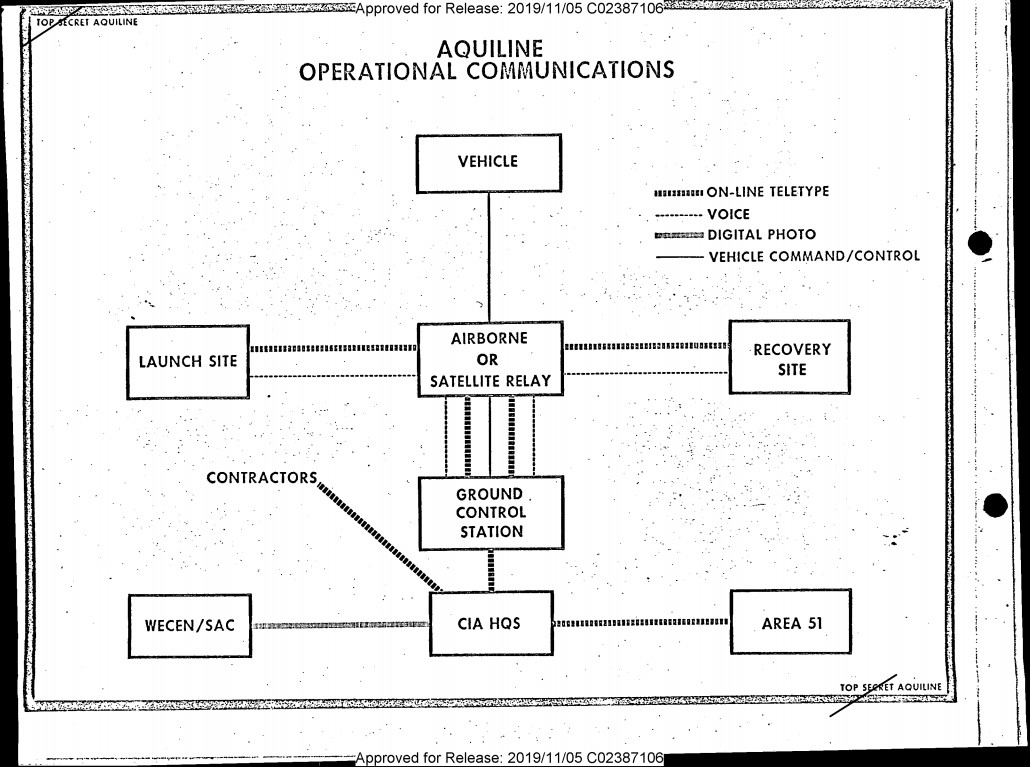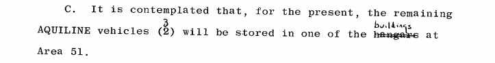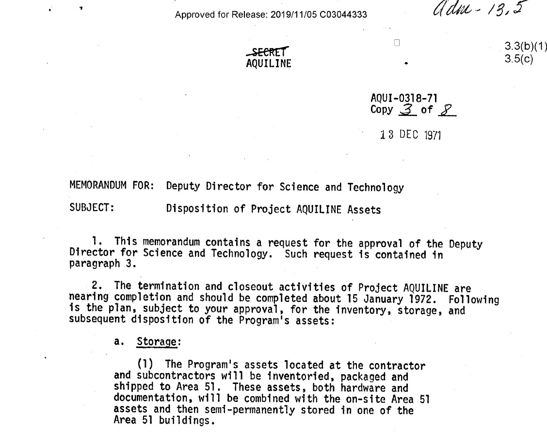 Project Aquiline phaseout documents reveal that after the program’s termination, all assets were transferred to Area 51 to “protect the Agency role in the Program and prevent unauthorized individuals from becoming aware of the existence of the AQUILINE vehicle, the covert testing site and the Agency’s overt/covert procurement and contracting methods.” Another memo laying out the disposition of the program’s assets states that all Aquiline hardware would be stored at Area 51 “semi-permanently” in one of the base’s buildings.