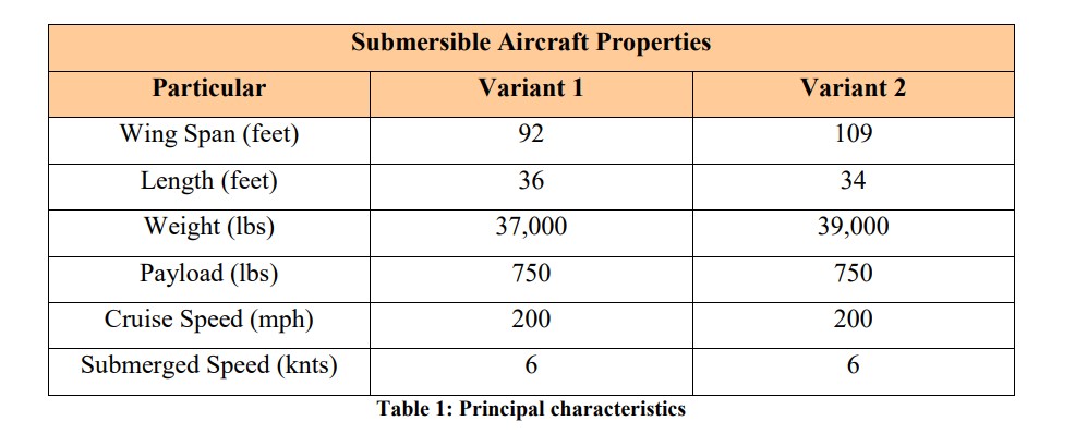 NSCW Carderock came up with two blended wing-body/flying wing-type designs for their submersible aircraft concept, one with a wingspan of 92 feet, and another with a wingspan of 109 feet. Aside from differences in size, both designs had fairly similar specifications in terms of payload, speed, and weight: