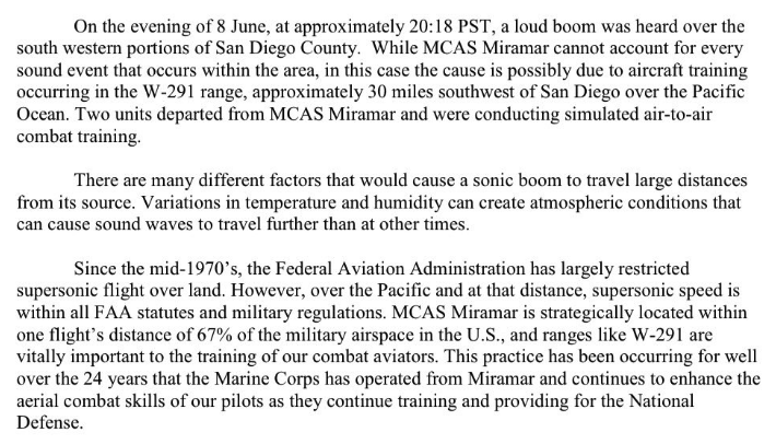 In a follow-up to our reporting earlier this week on the mysterious boom heard around San Diego on the evening of June 8th, 2021, we can now report that Marine Corps Air Station Miramar has put out a statement saying essentialy “it was probably us.”