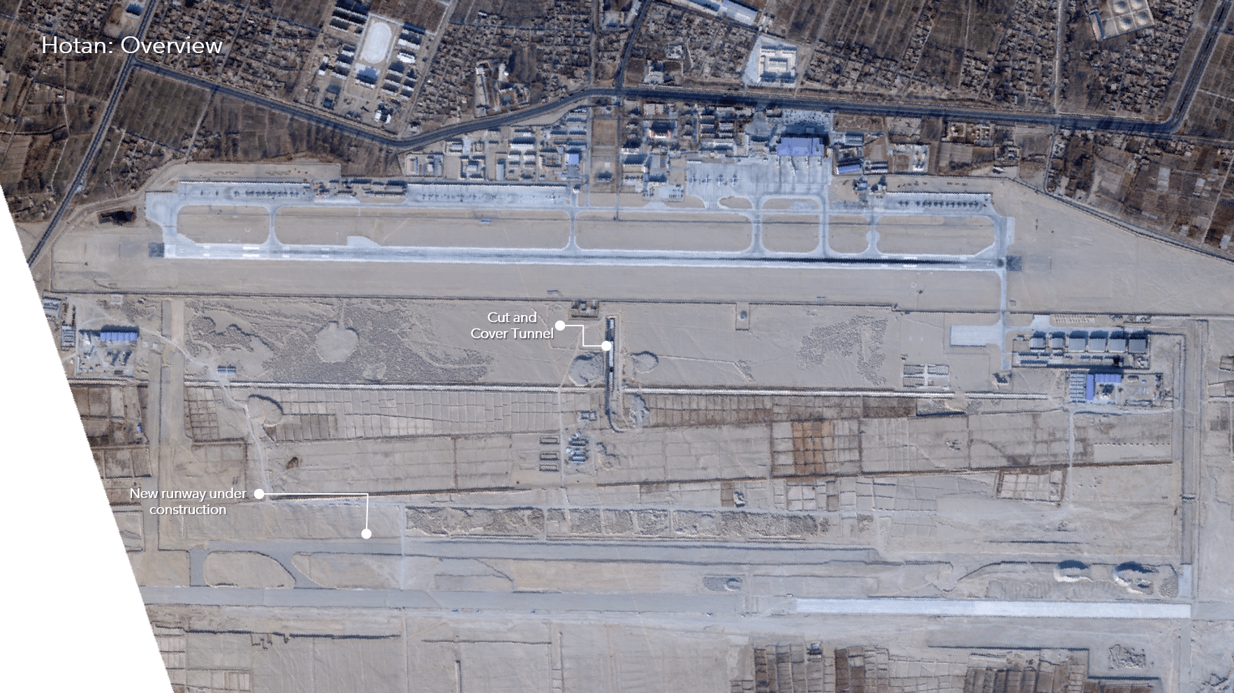 At Hotan Air Base, which is co-located with the civilian airport in Hotan, a Chinese city in Xinjiang, there has been construction of a new, second runway with its own parallel taxiway. However, additional developments at the airbase leave no question about the military purpose of new infrastructure at Hotan.