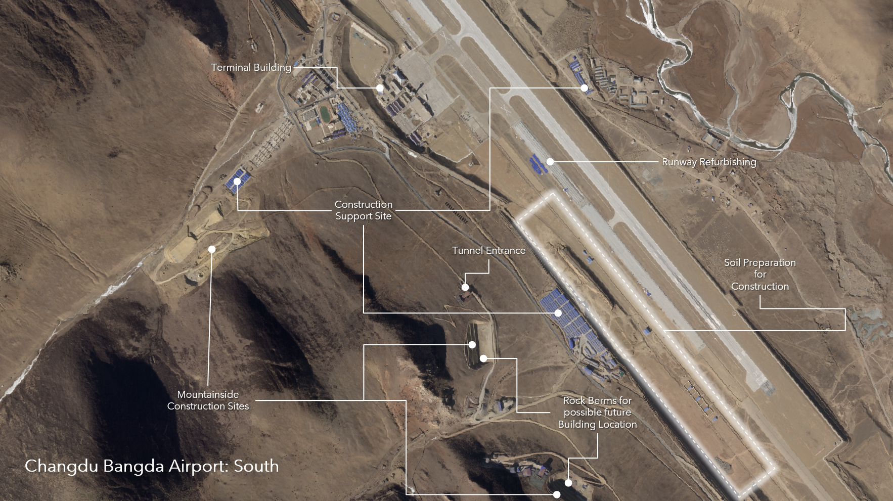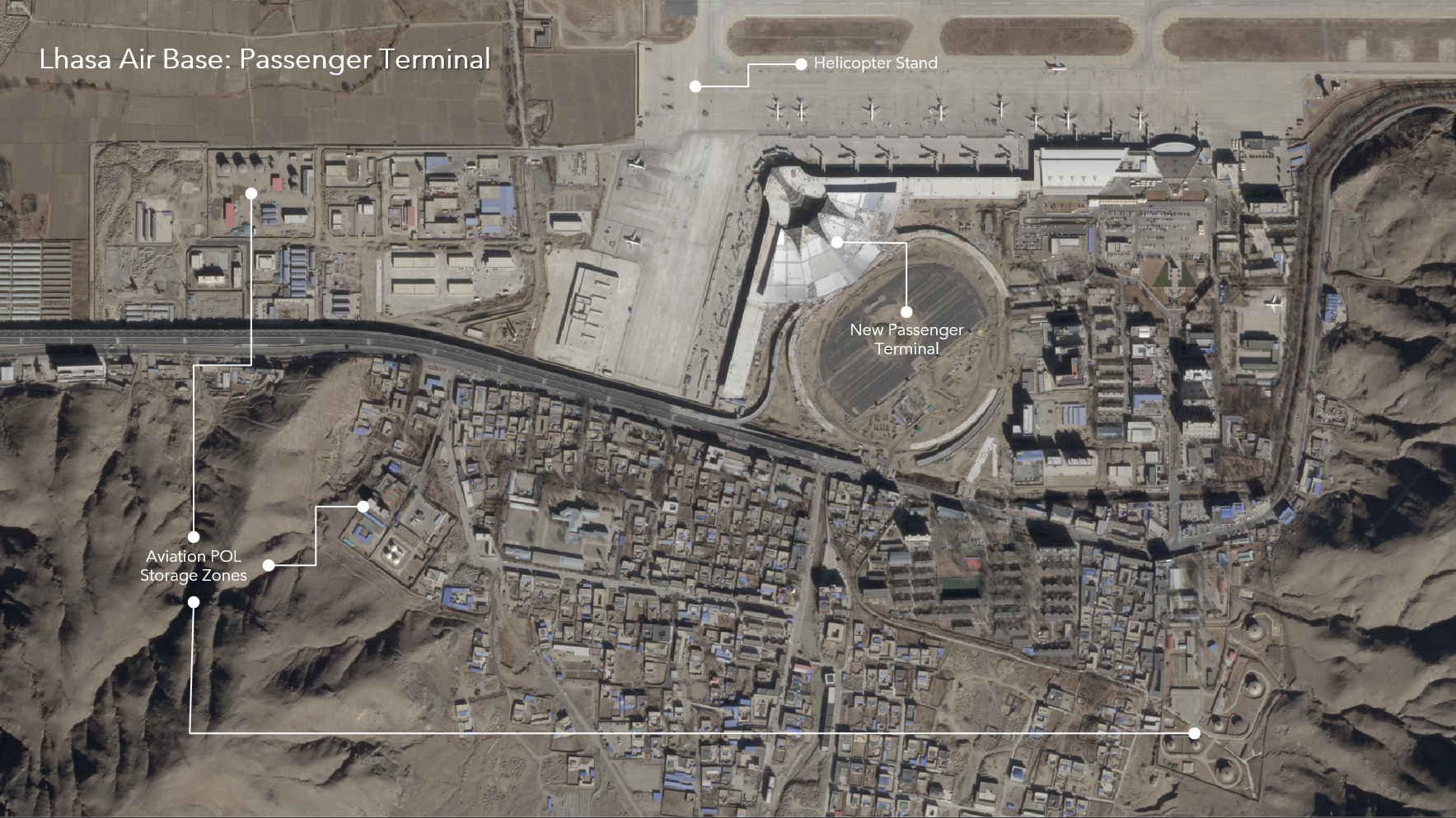Just as at Ngari Gunsa and Hotan, these expansions also include newly developed maintenance and support areas. At Lhasa, an entirely new helicopter staging area also appears to be under construction, which, in combination with the many heliports China is constructing in the region, as well as elsewhere in the country, draws attention to the Chinese military’s emphasis on rotary-wing capabilities.