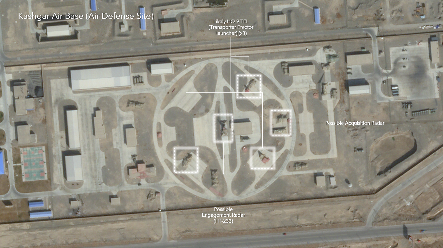 Satellite imagery of Kashgar Air Base, located along China’s western borders in Xinjiang, shows the construction of more hardened aircraft shelters as well as maintenance and support areas. In addition to these expansions in support of fighter aircraft operations, the developments at Kashgar also include an extension of the apron that is typically home to H-6 strategic bombers, and a temporary aircraft shelter that appears to support UAV operations. The facility also boasts a new, already active, air defense site integrated within the grounds of the airbase itself. The imagery shows likely HQ-9 surface-to-air missile systems deployed at this site.