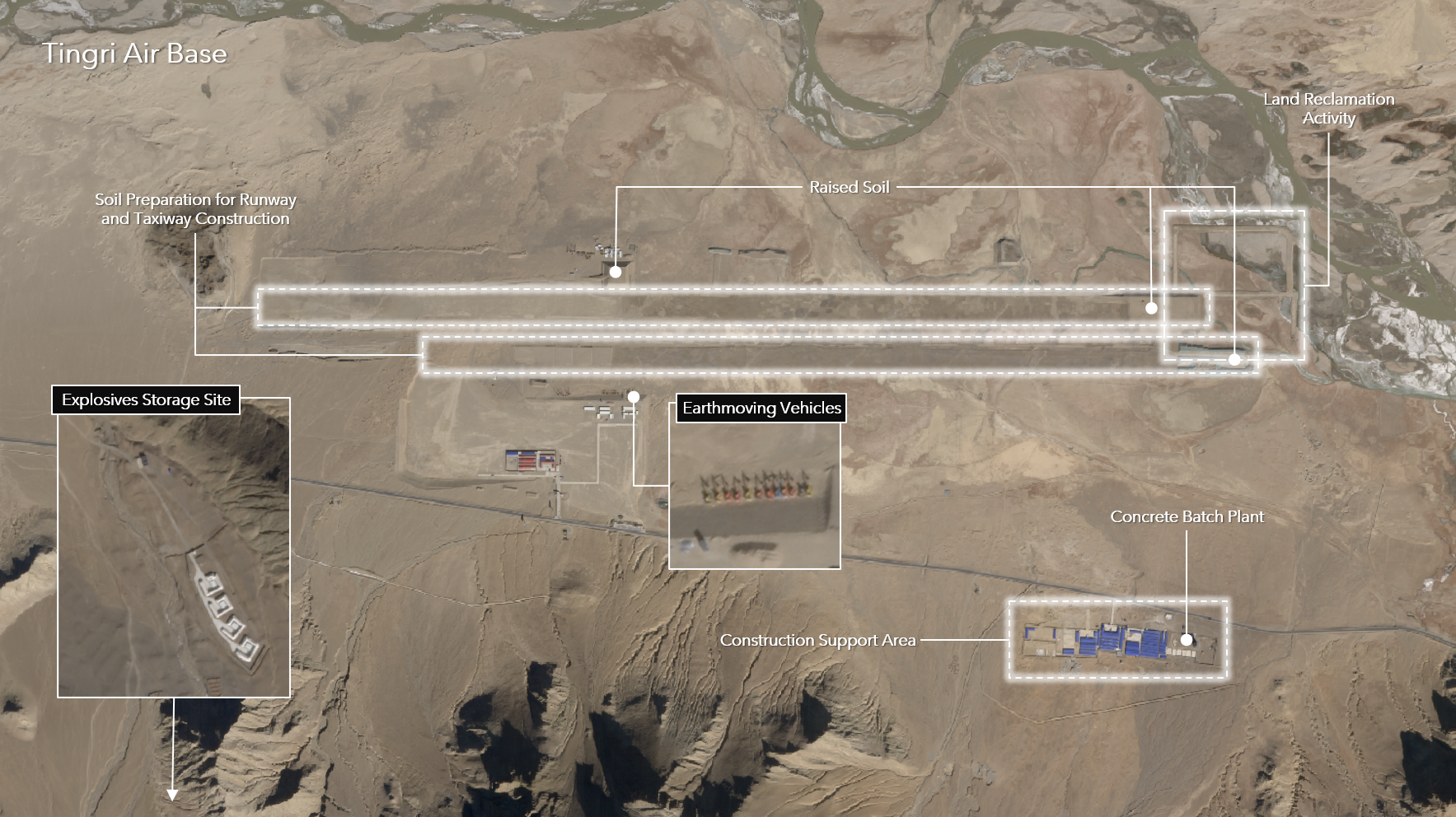 In addition to the enhancement of infrastructure at existing airbases and airports, satellite imagery has also shown the ongoing construction of entirely new runways at various locations in and around Tibet. The runways are being constructed at locations that previously have not hosted airports or other military infrastructure. These runways are located at Tingri and Damxung, both located in portions of eastern Tibet opposite Sikkim and Arunachal Pradesh, as well as Tashkorgan in Xinjiang near China’s border with Tajikistan.