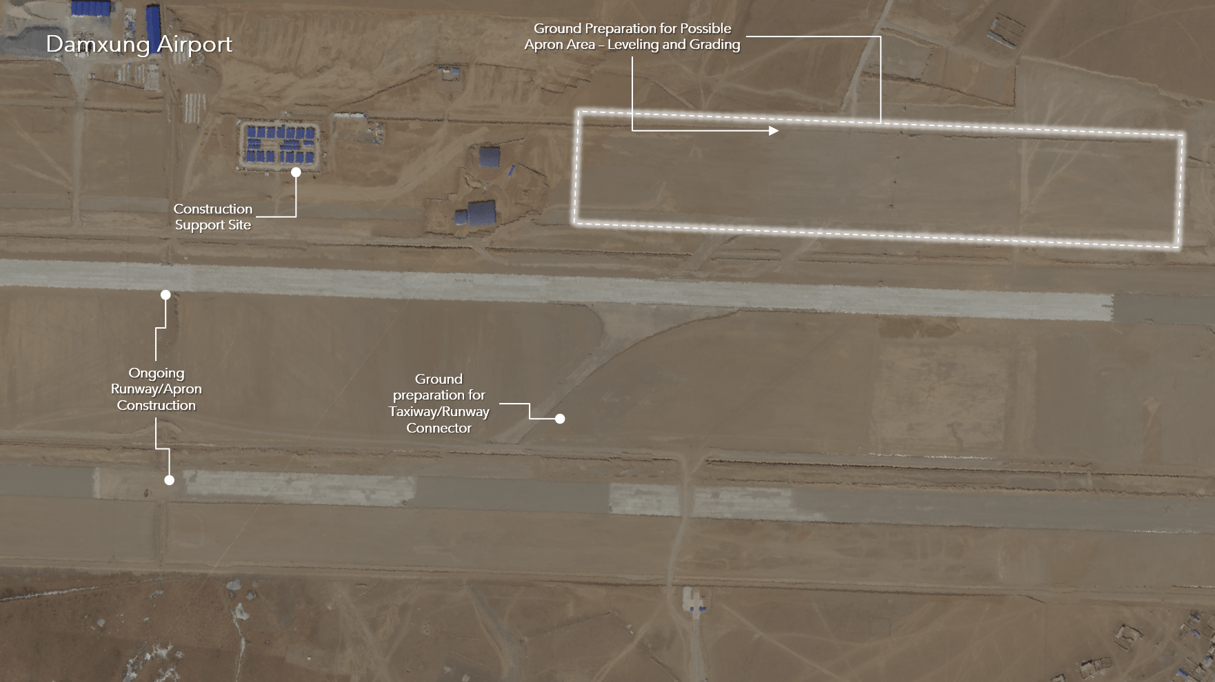 Imagery clearly shows soil preparation and outlines of runways, aprons, and support areas under construction at these locations. The military character of these facilities cannot yet be derived from these observations, however. Still, the reality is that any additional runway capacity in Tibet and Xinjiang adds to the overall air combat potential capacity and resiliency of the PLAAF along China’s western borders.