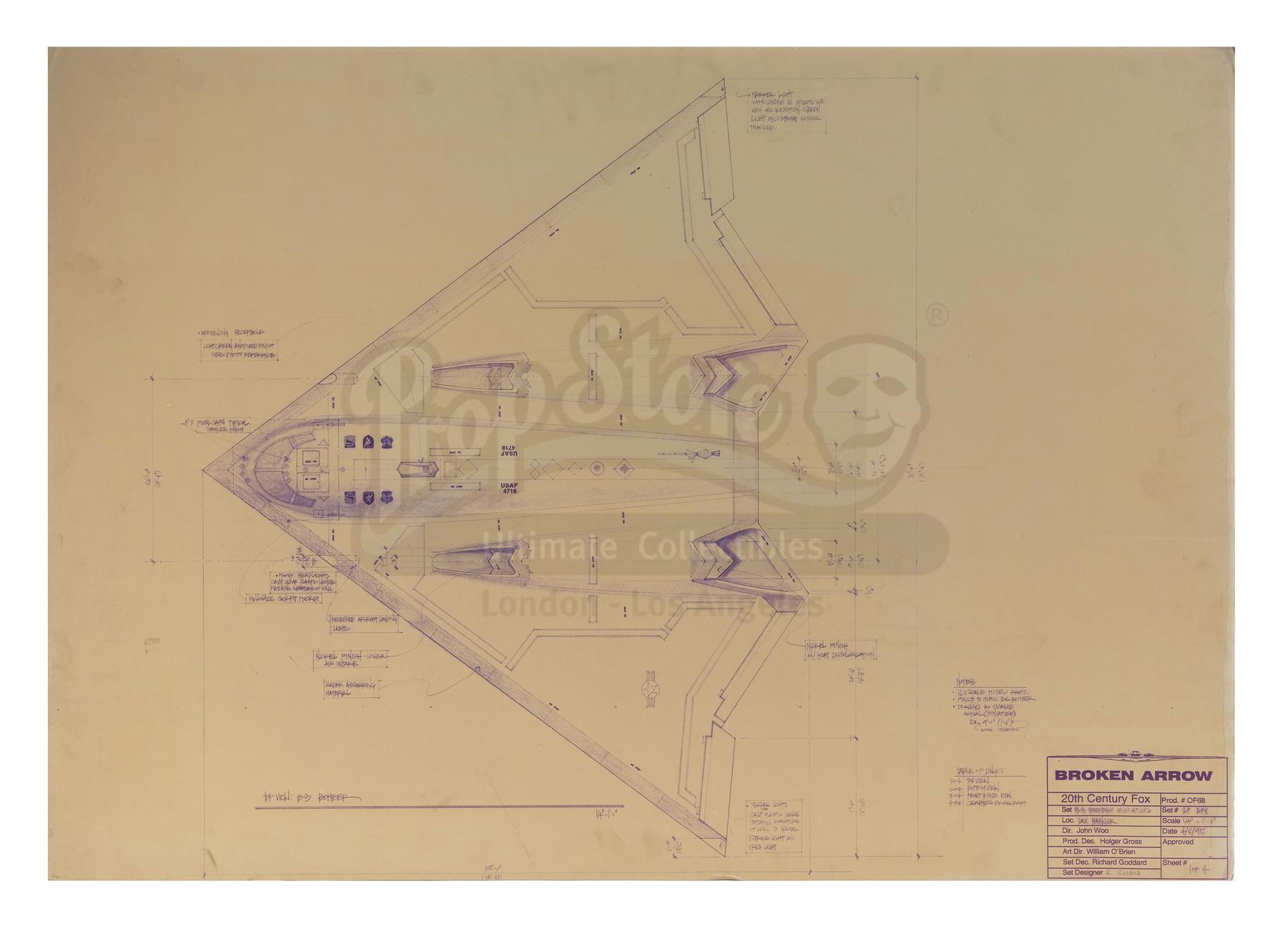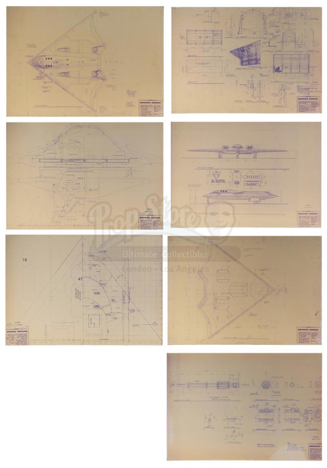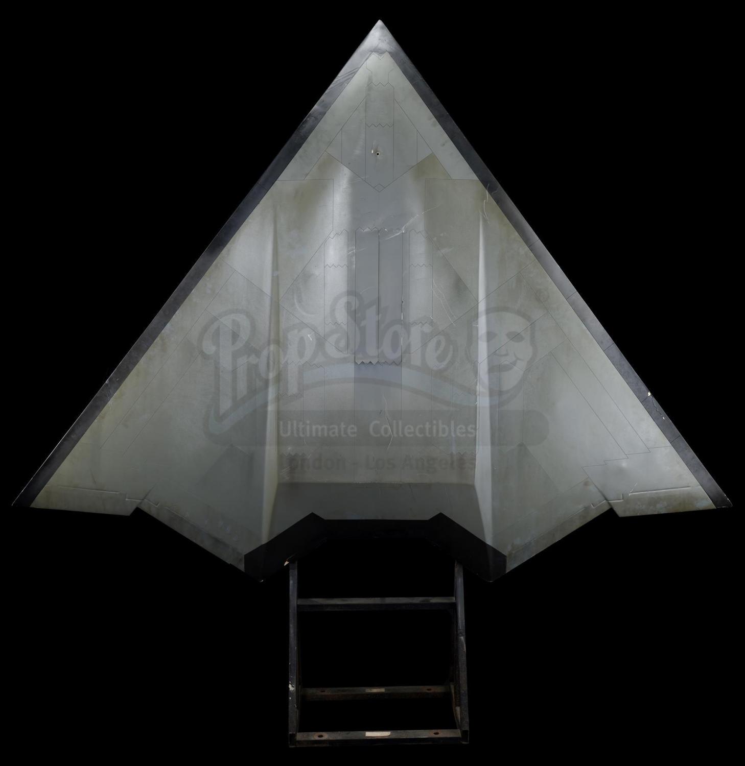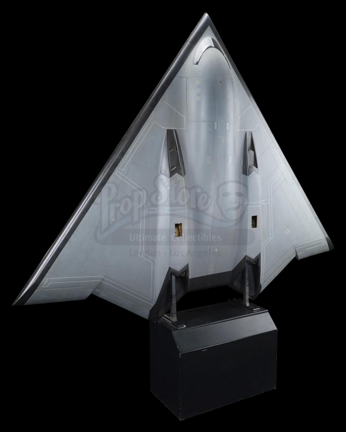 A B-3 Stealth Bomber model miniature from John Woo’s action thriller Broken Arrow. Vic Deakins (John Travolta) hijacked the B-3 Stealth Bomber from his co-pilot Riley Hale (Christian Slater) in an attempt to steal the nuclear missiles that the plane was carrying.