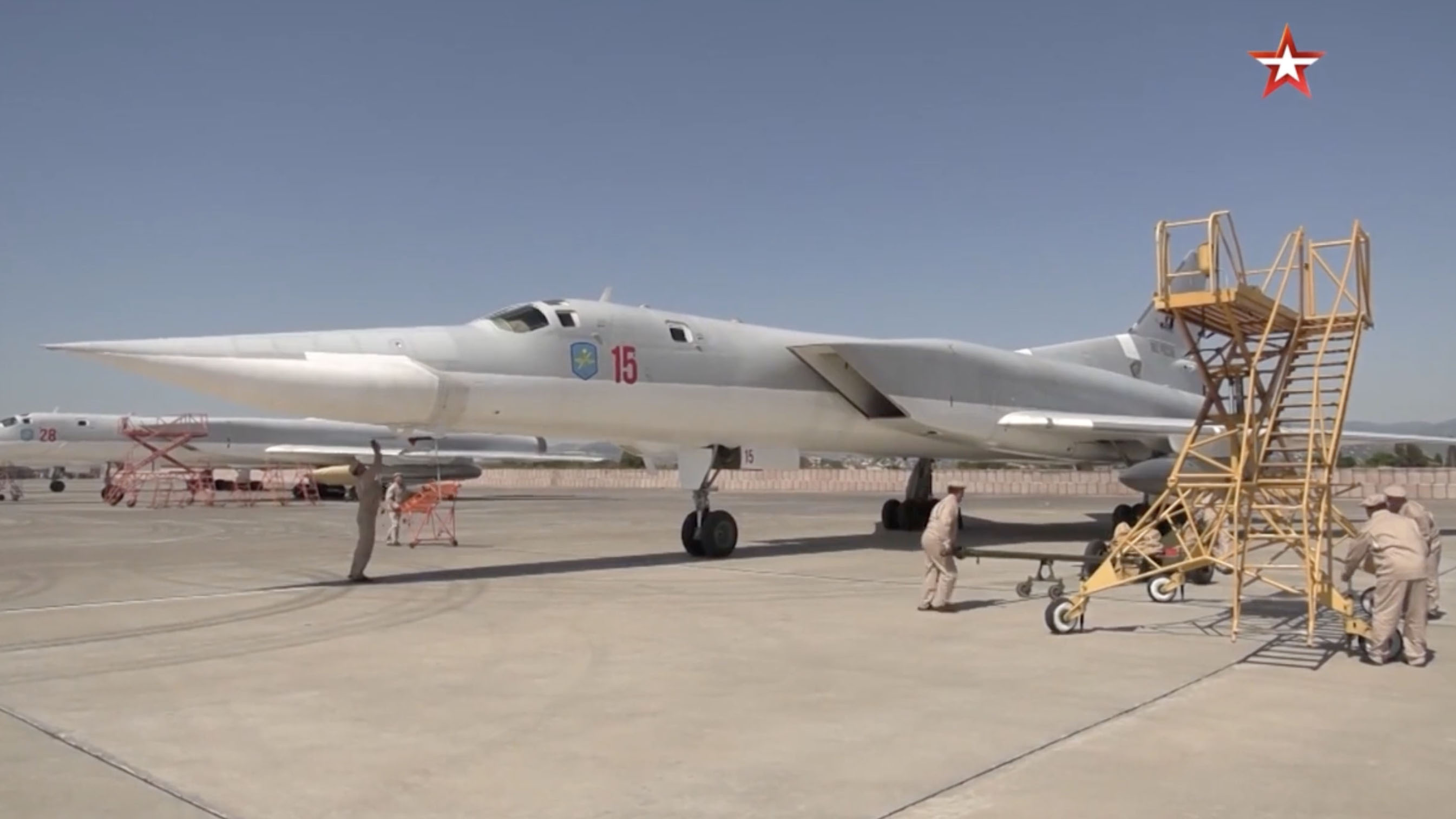 Three Tu-22M3s are also seen in the footage — aircraft ‘Red 15,’ ‘Red 28,’ and ‘Red 50’ — two of which are armed with Kh-22 or Kh-32 series long-range cruise missiles. Of these Backfires, both ‘Red 15,’ wearing the Russian registration RF-94149, and thought to be home-based at Shaykovka in western Russia, and ‘Red 50,’ RF-34091, from Belaya in the Russian Far East, participated in the previous deployment to Syria, late last month.